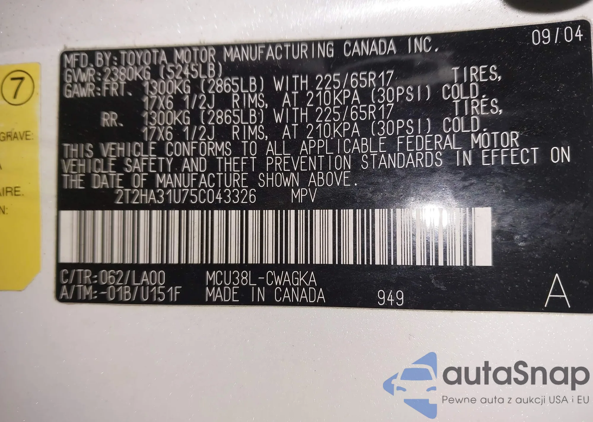 • VIN 2T2HA31U75C043326