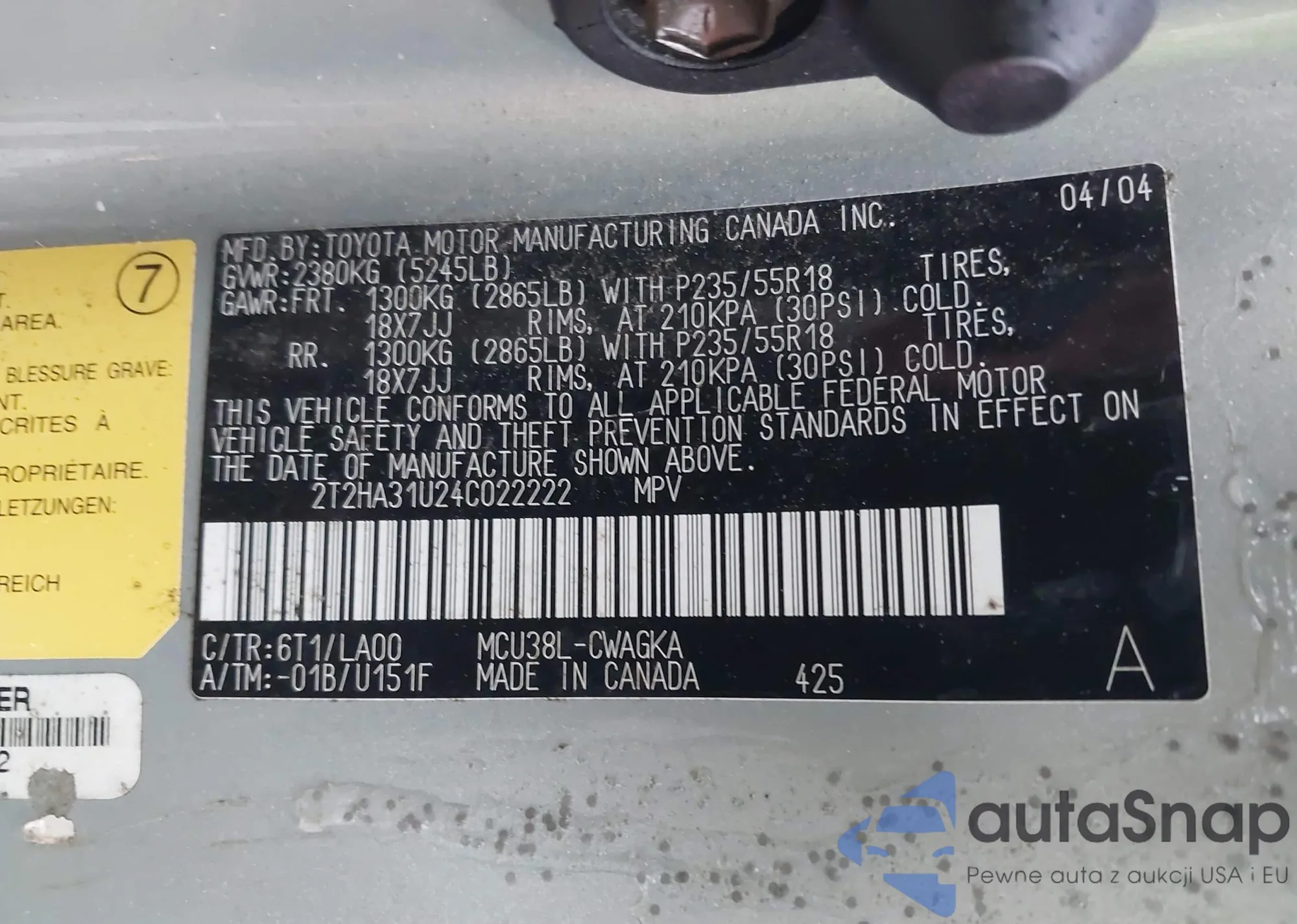 • VIN 2T2HA31U24C022222
