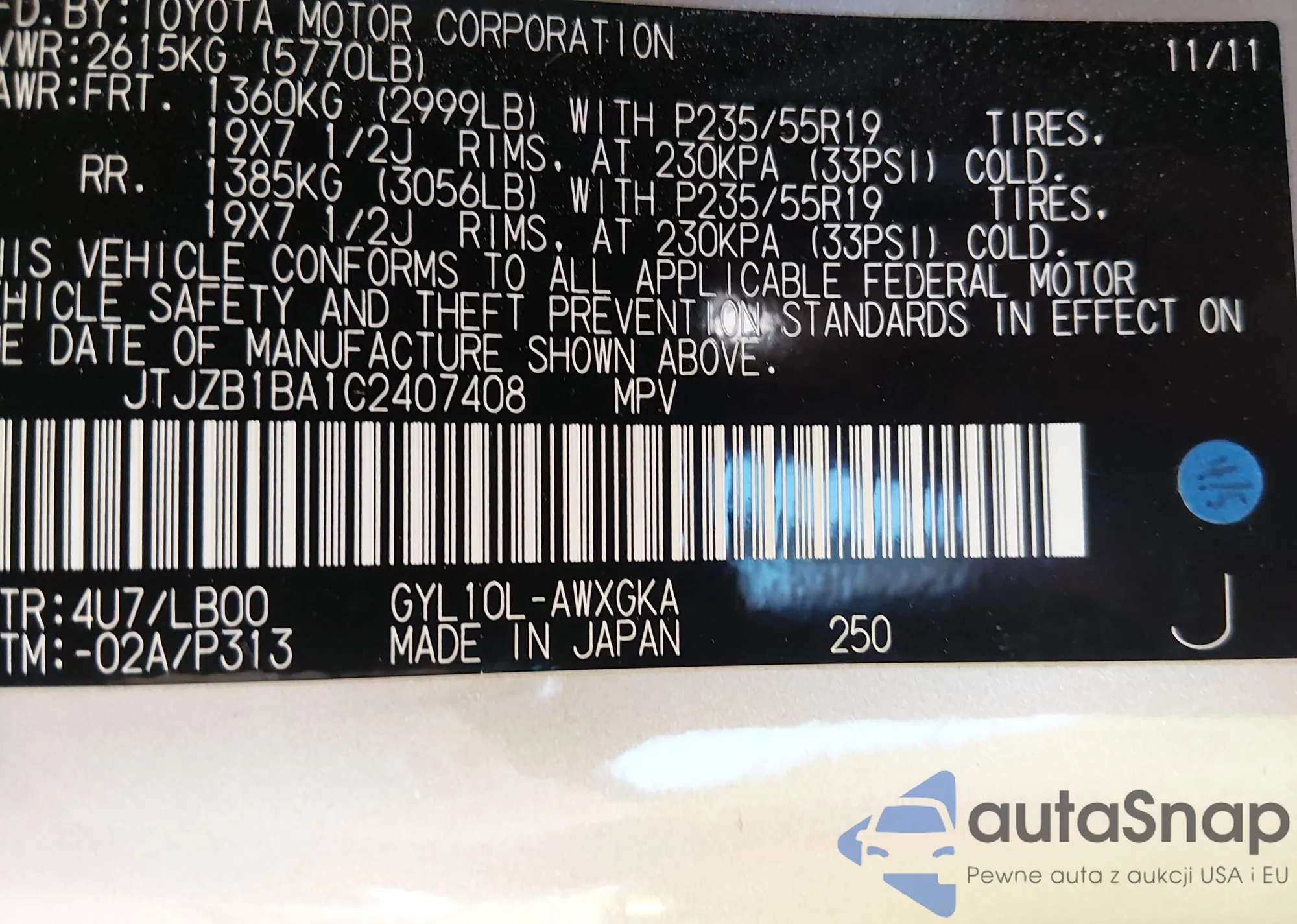 • VIN JTJZB1BA1C2407408