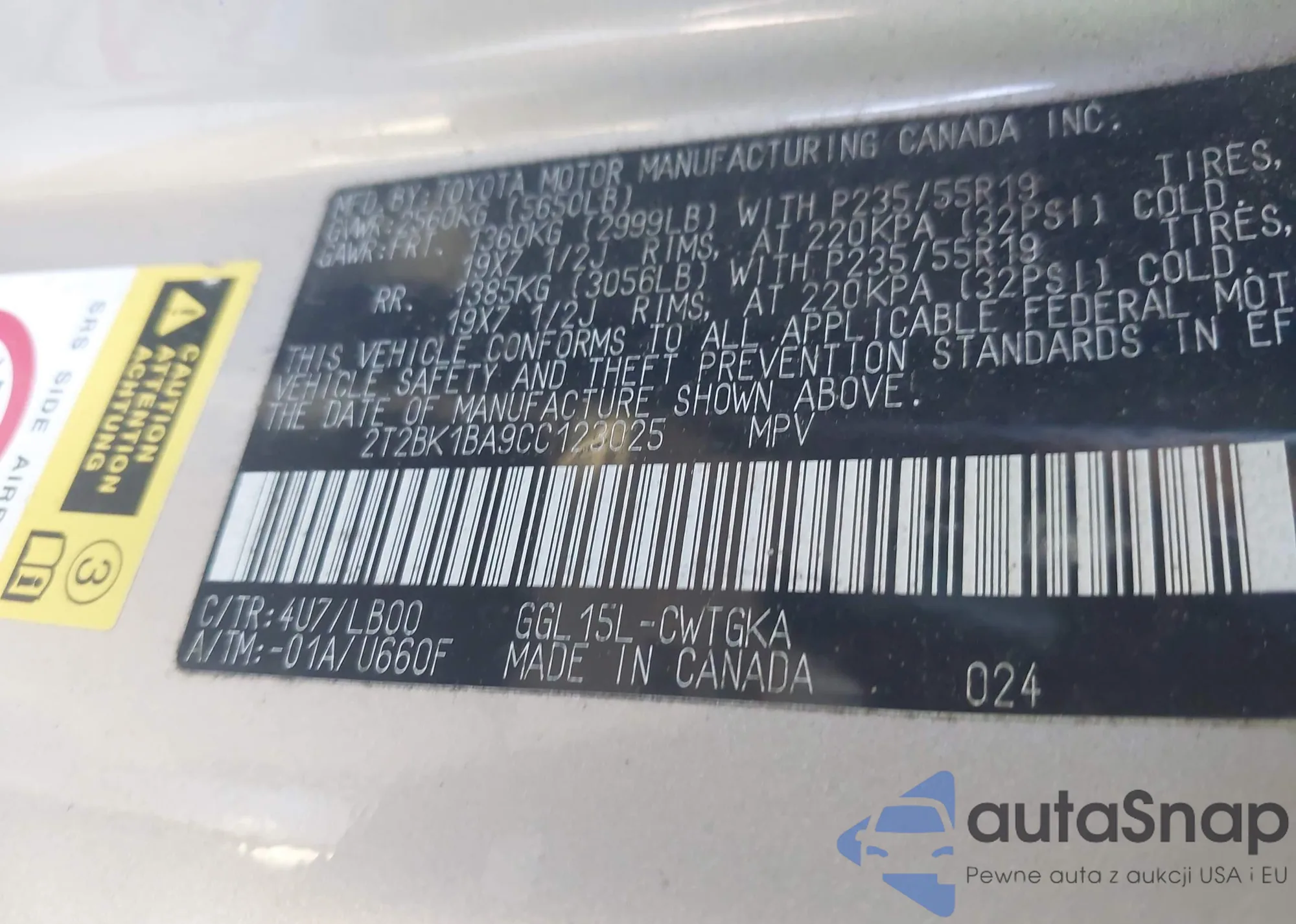 • VIN 2T2BK1BA9CC123025