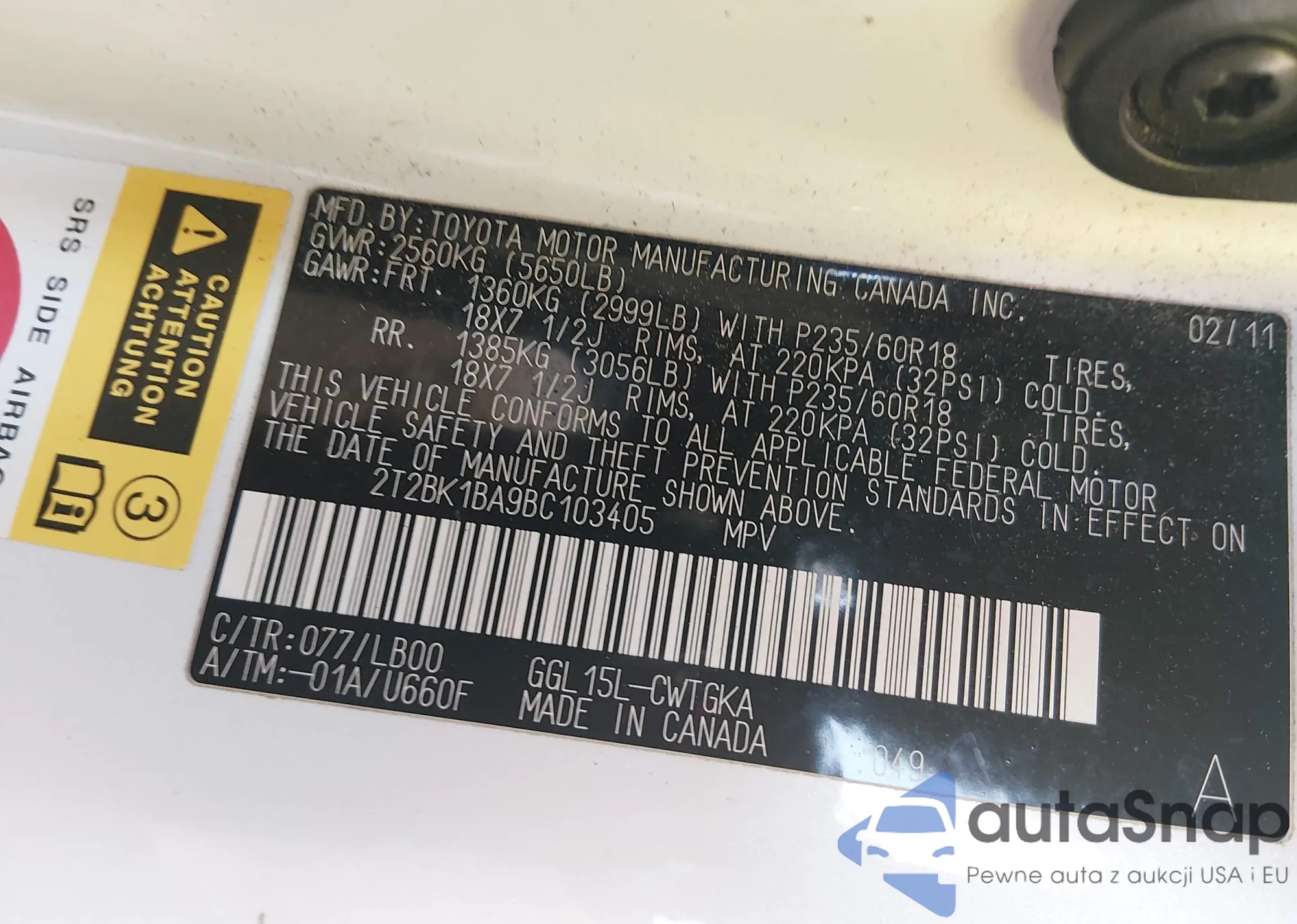• VIN 2T2BK1BA9BC103405