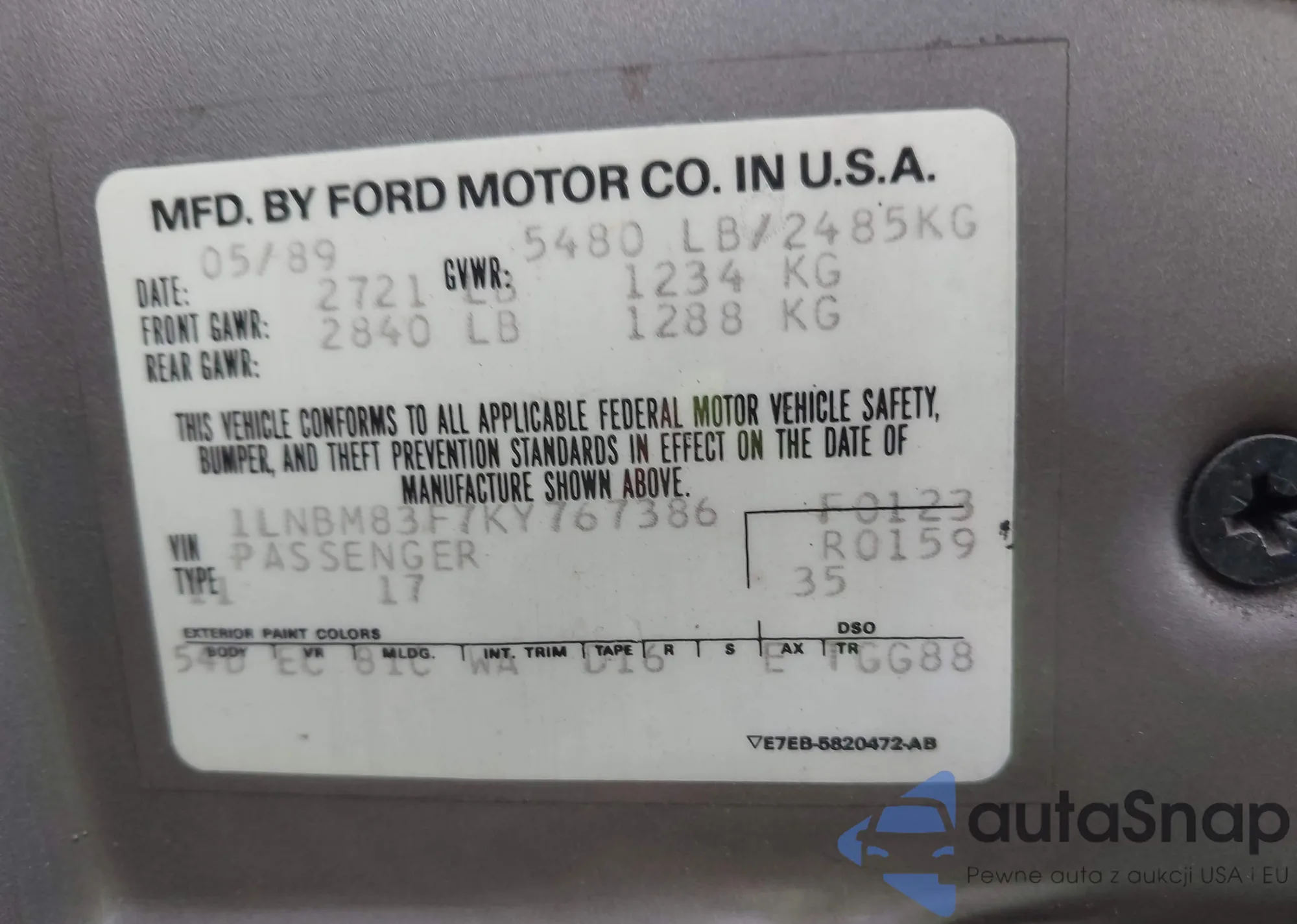 LOT: 42423559 VIN: 1LNBM83F7KY767386