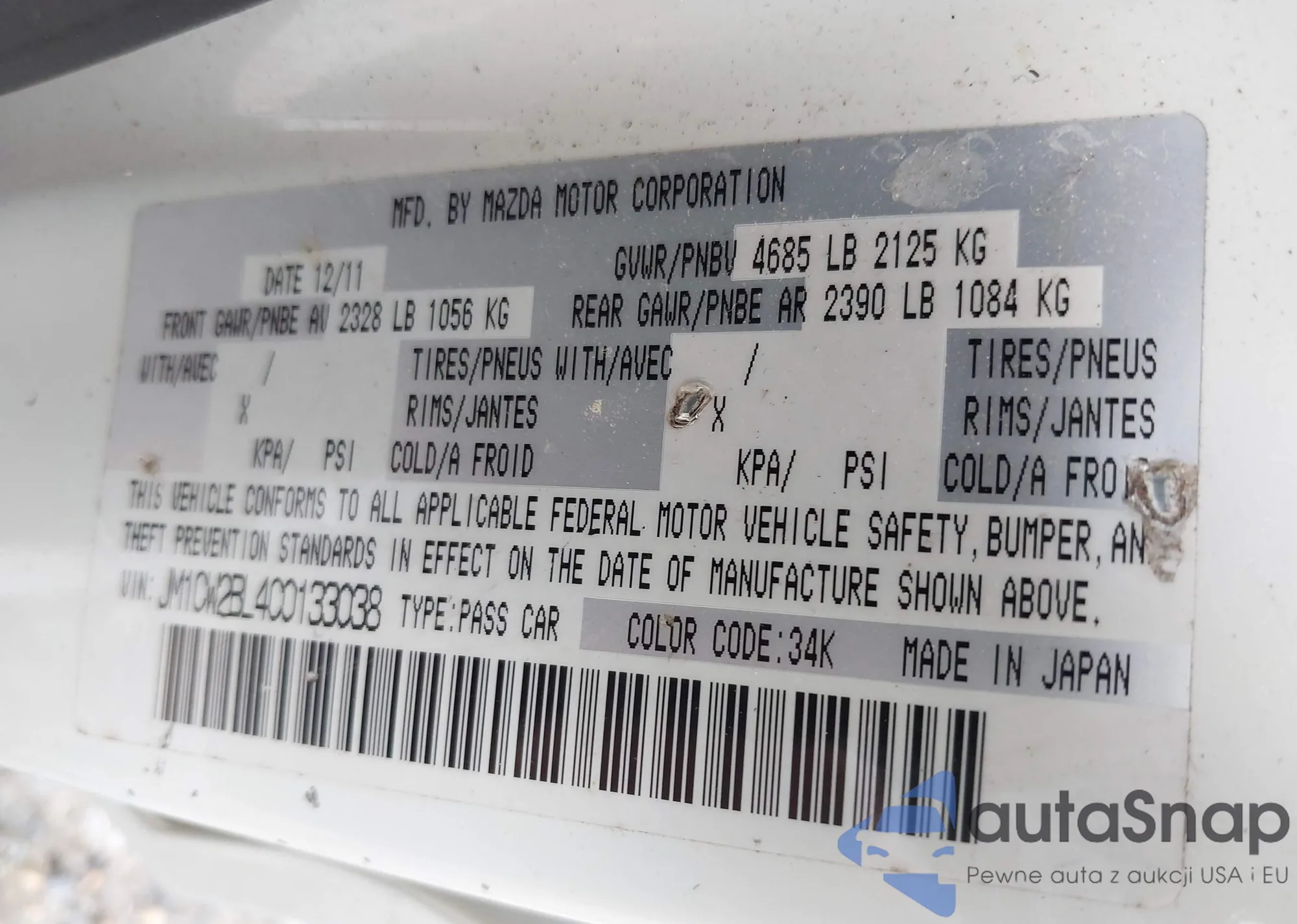 LOT: 39273923 VIN: JM1CW2BL4C0133038