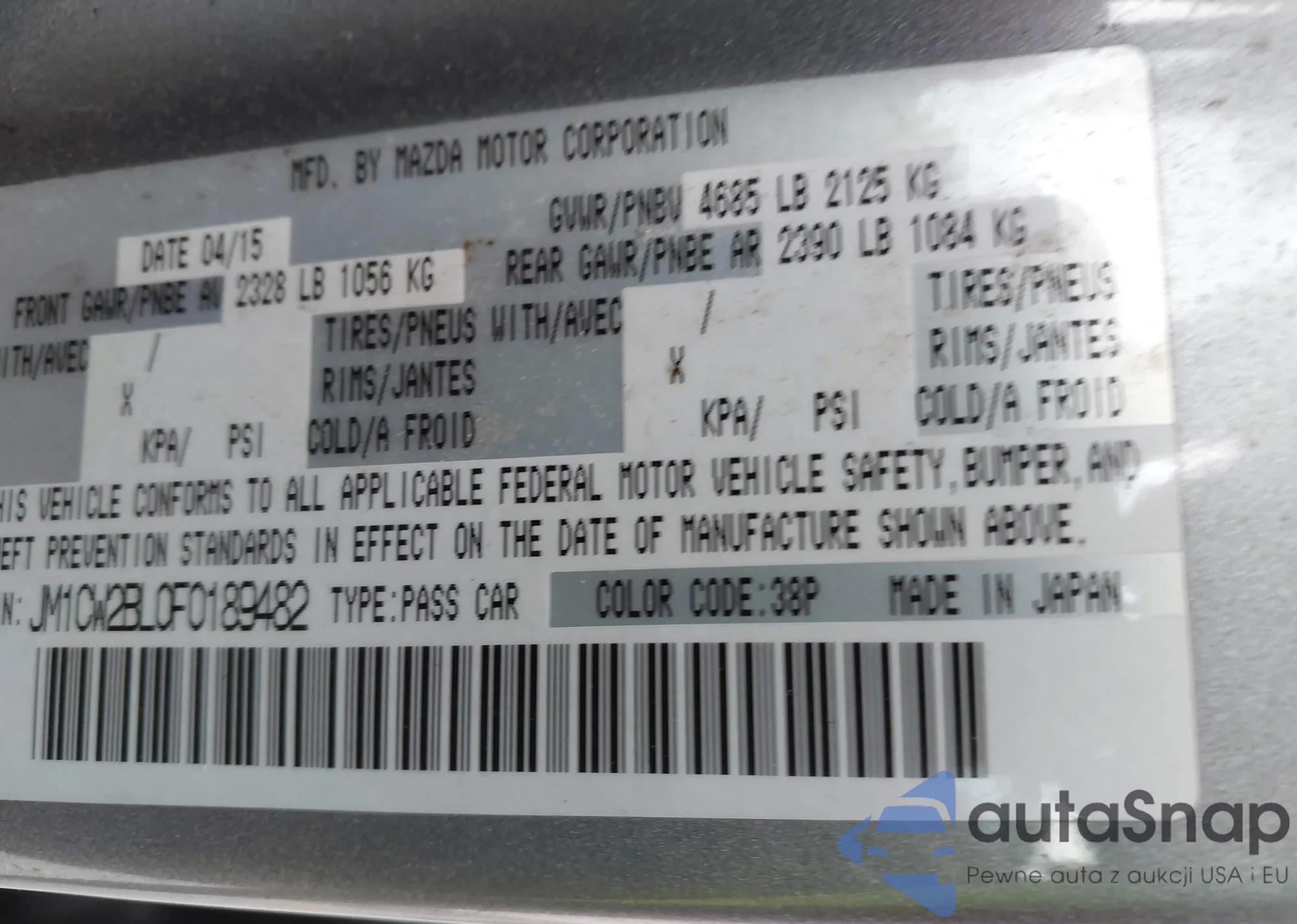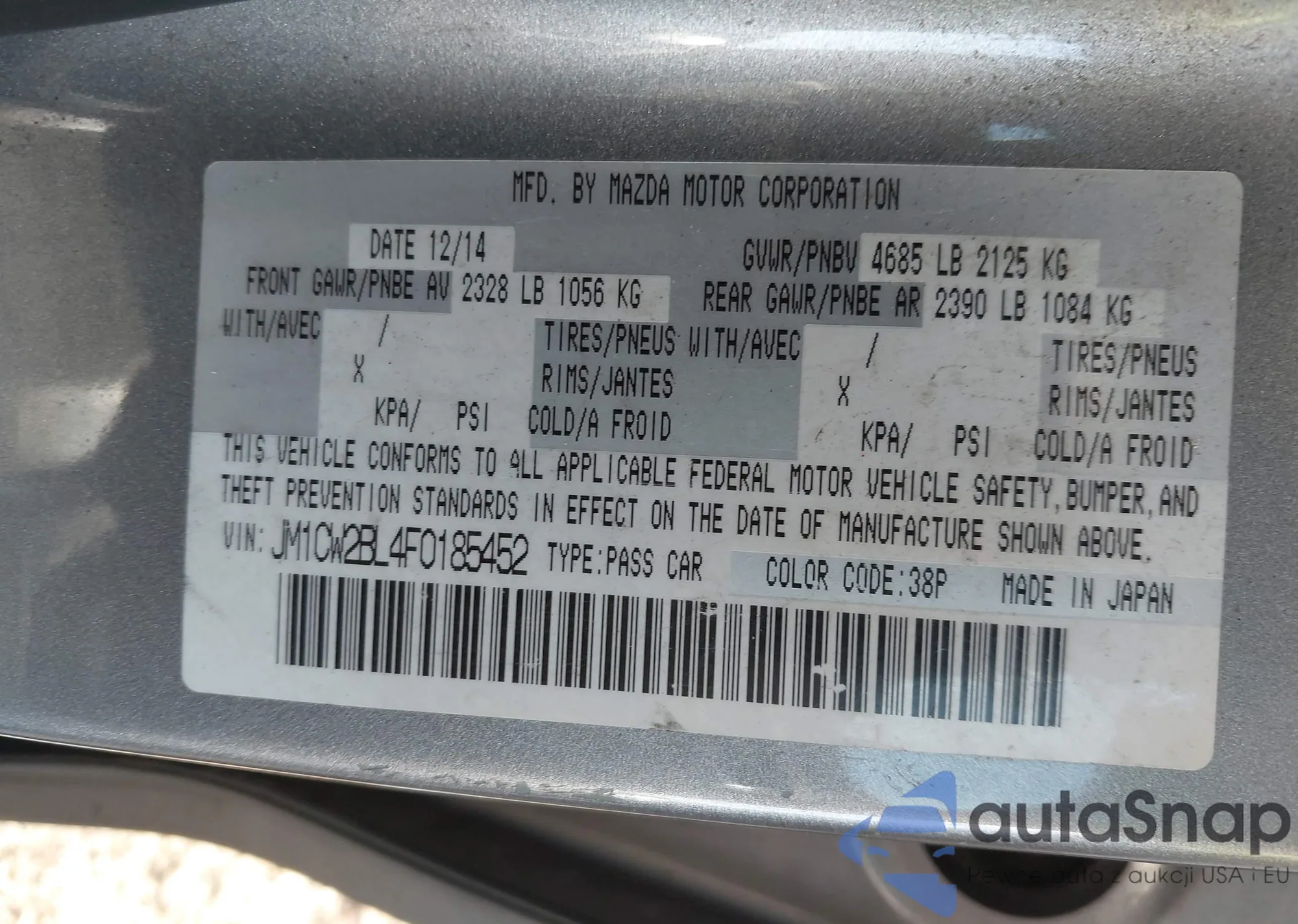 LOT: 43900033 VIN: JM1CW2BL4F0185452