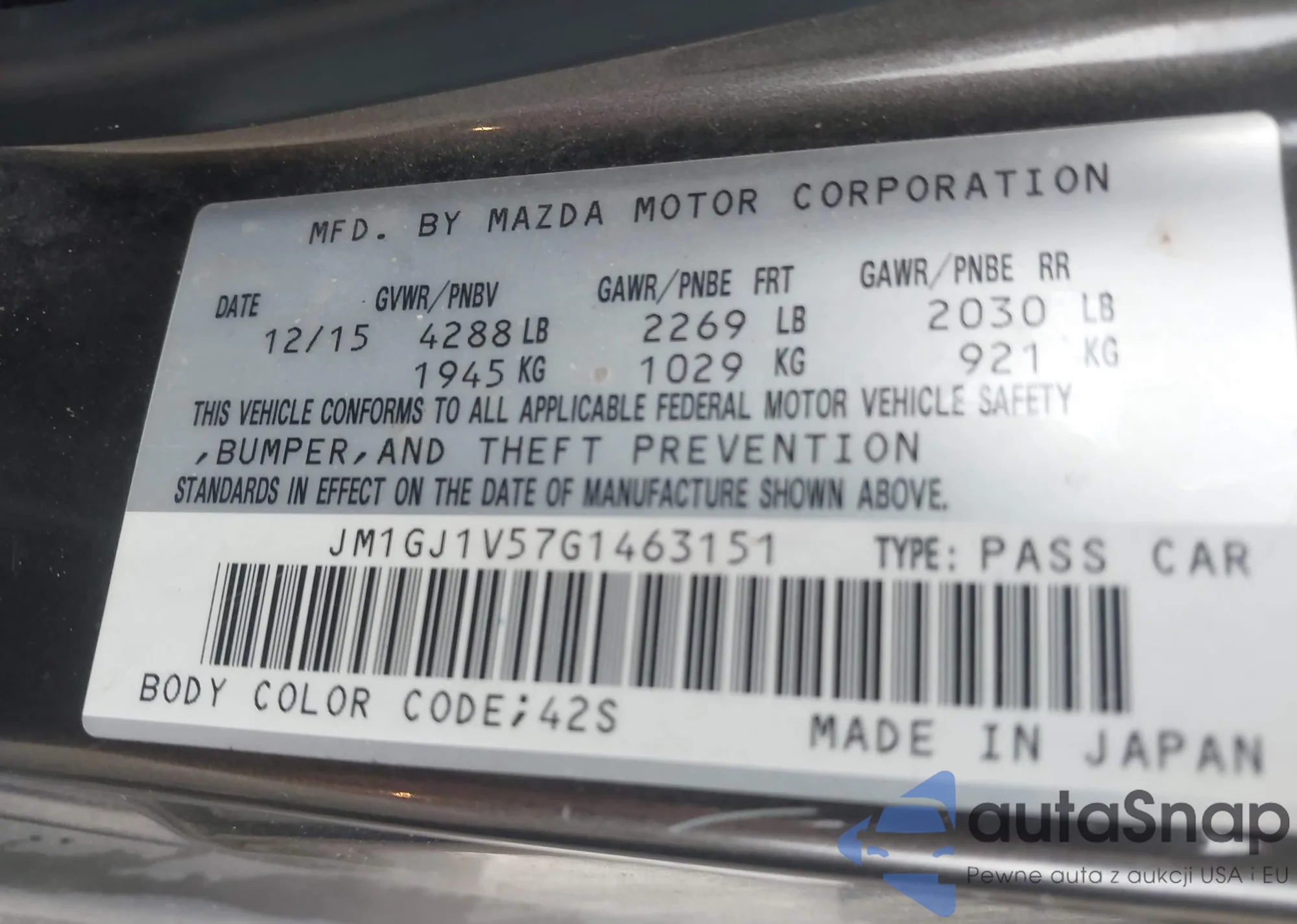 LOT: 98200745 VIN: JM1GJ1V54F1204888
