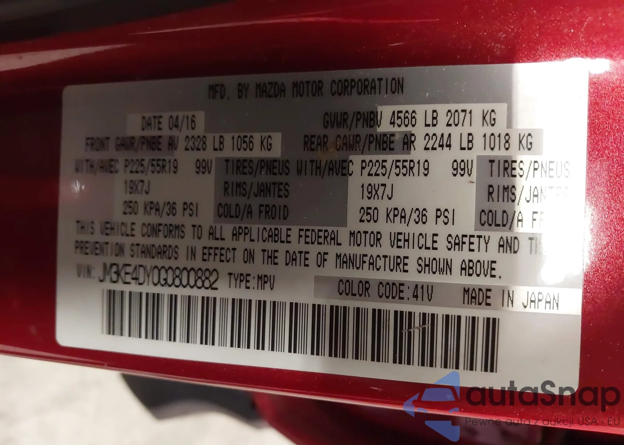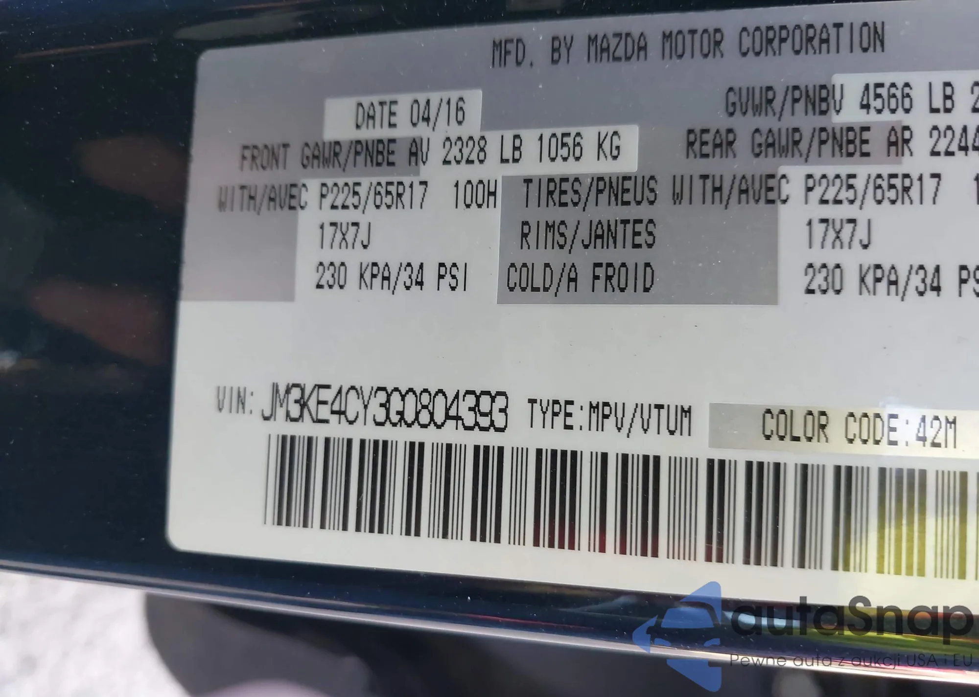 LOT: 40529508 VIN: JM3KE4CY3G0804393