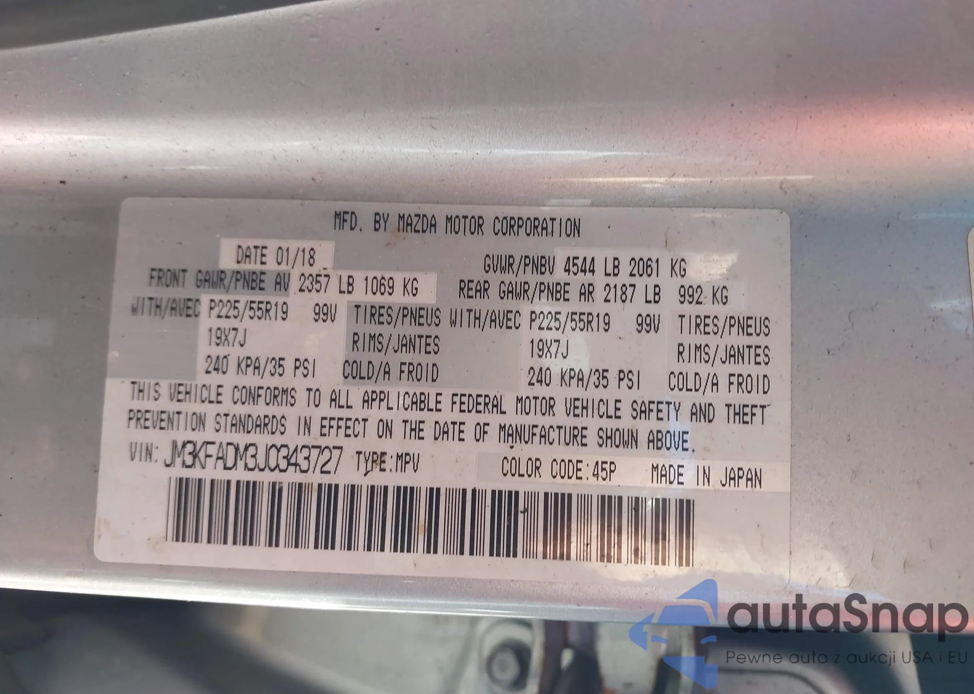LOT: 44467223 VIN: JM3KFADM3J0343727