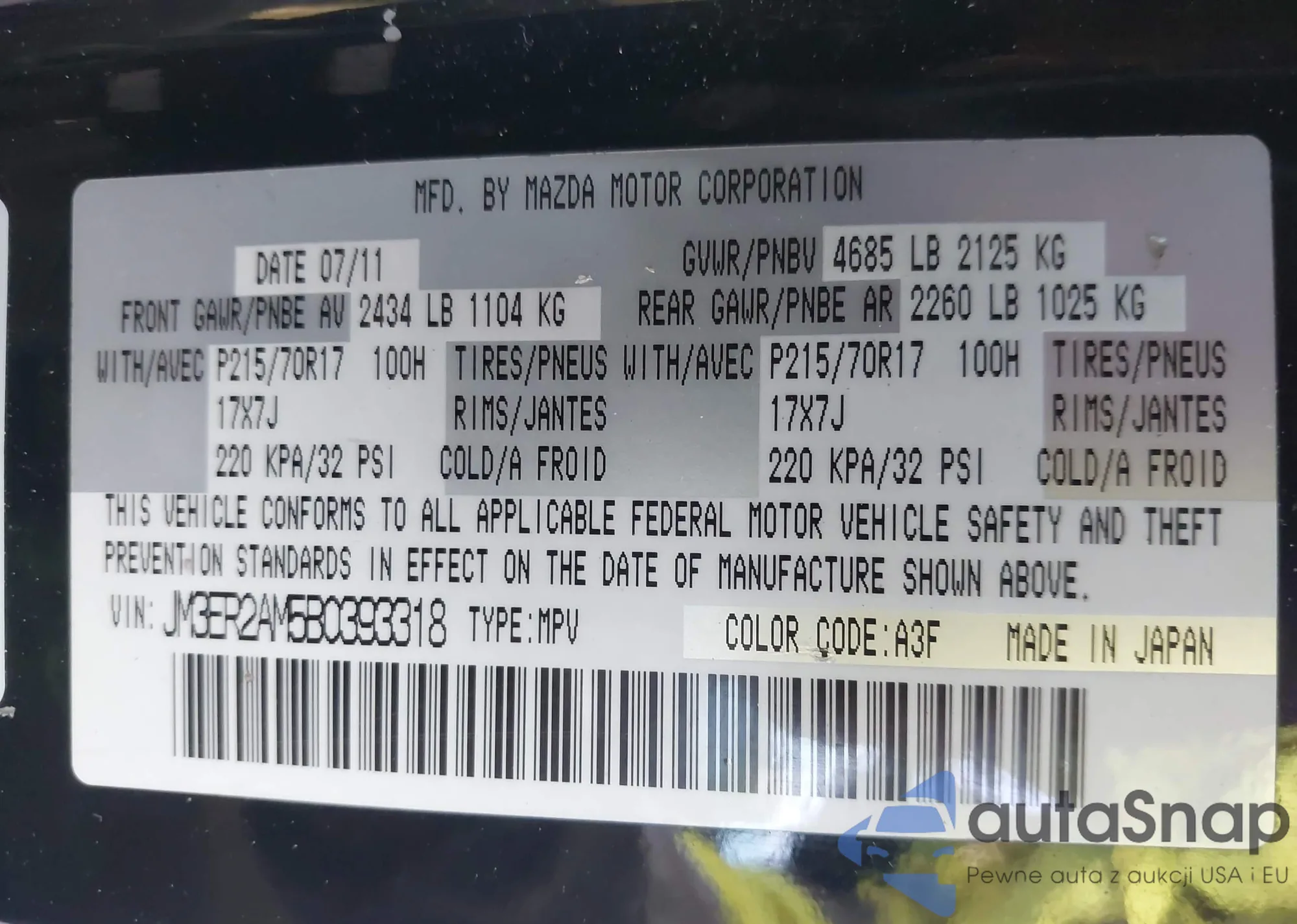 LOT: 44032534 VIN: JM3ER2AM5B0393318