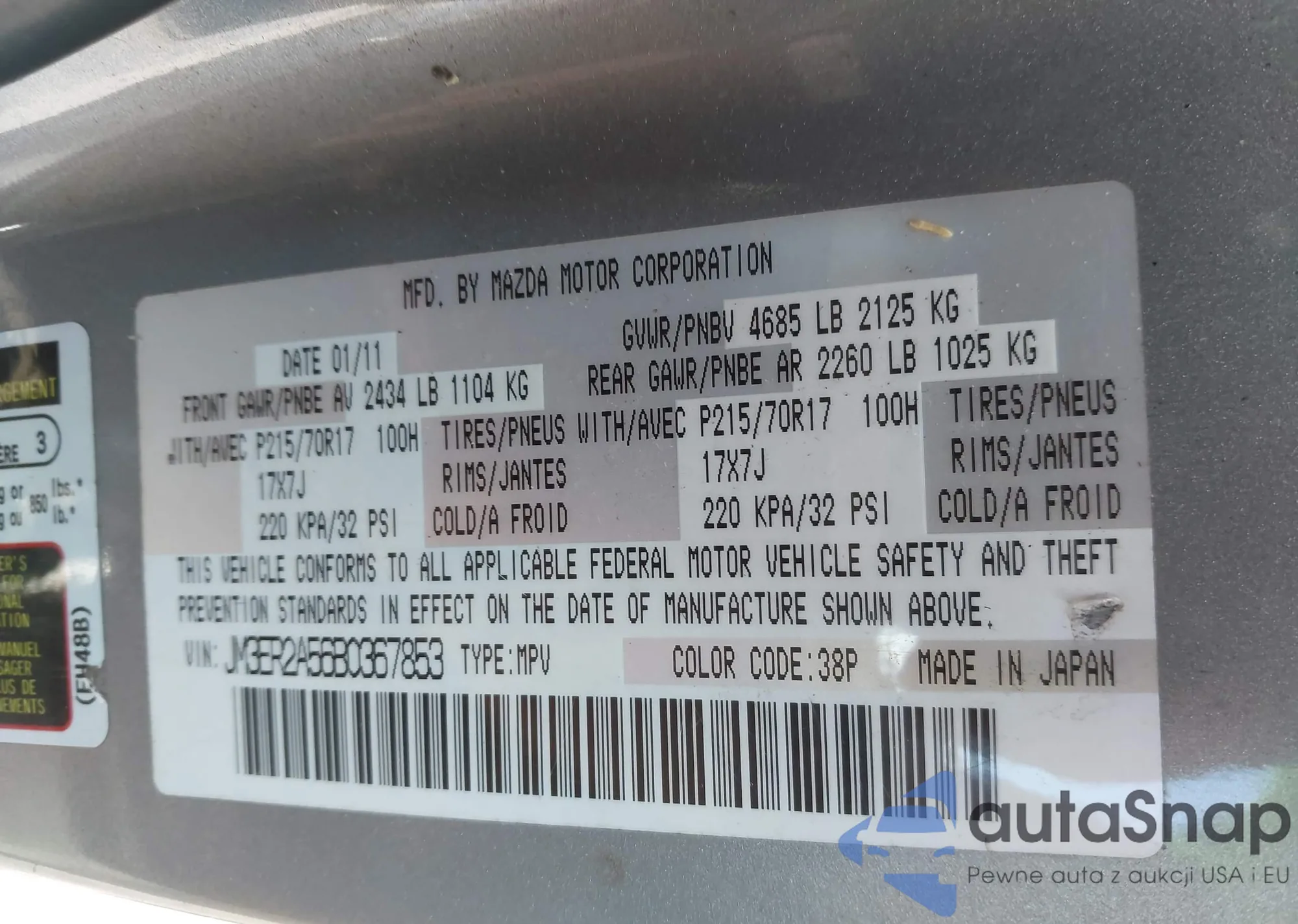 LOT: 44067813 VIN: JM3ER2A56B0367853