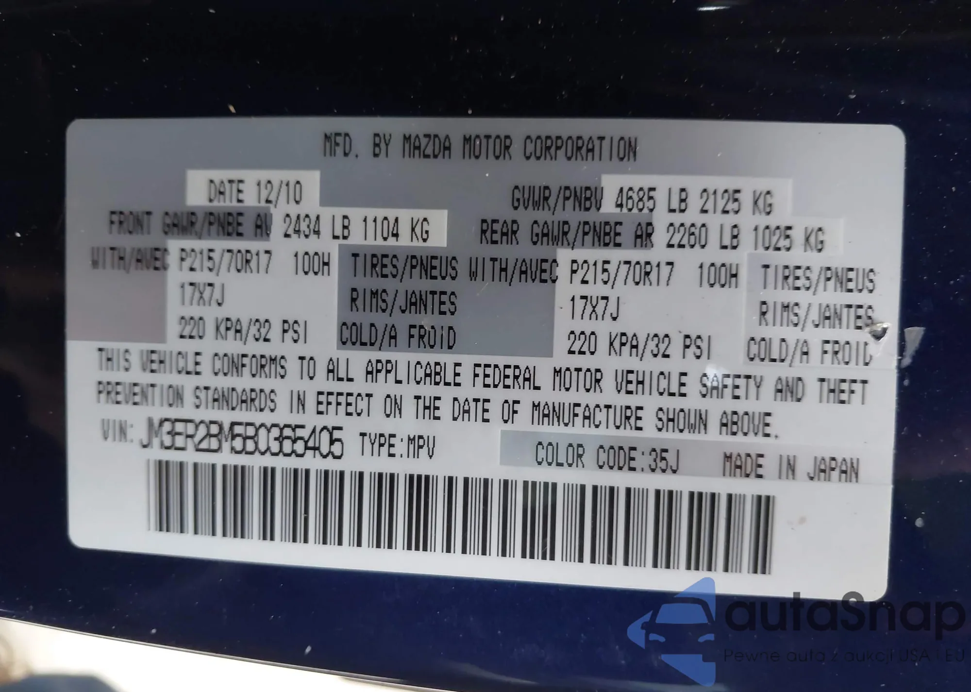 • VIN JM3ER2BM5B0365405