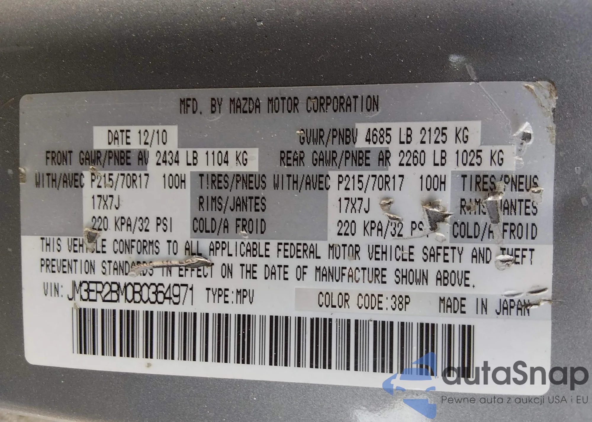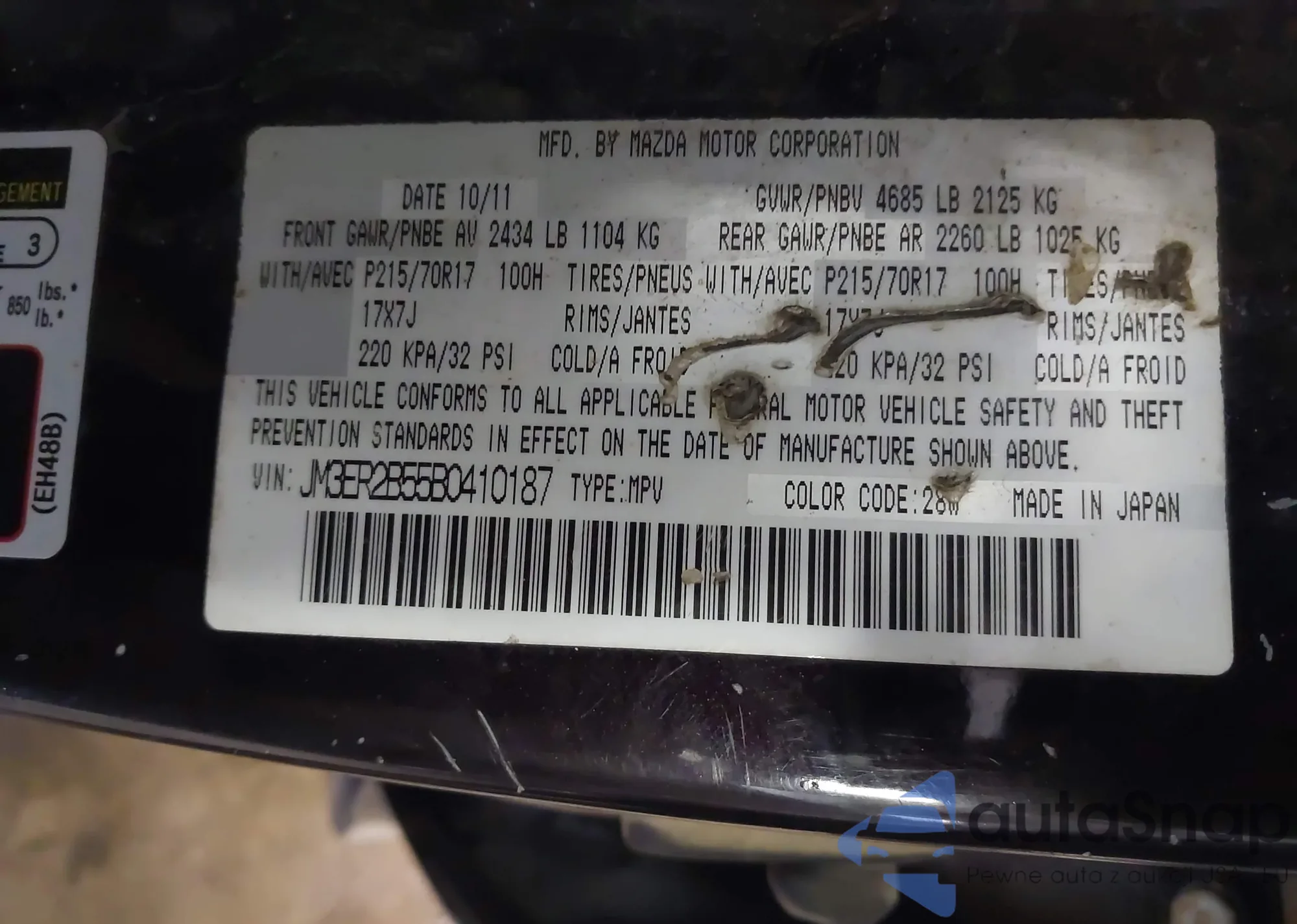 LOT: 43520135 VIN: JM3ER2A59B0394867