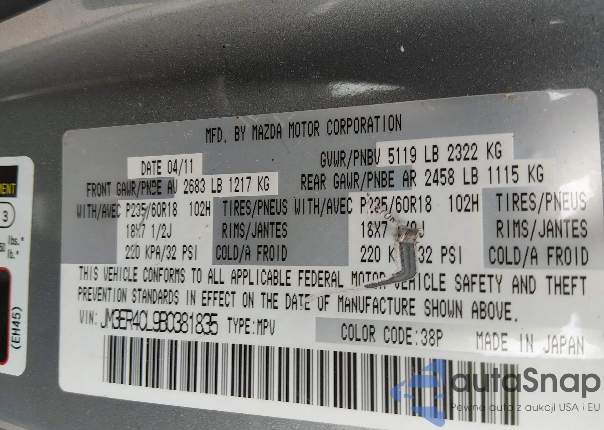 LOT: 44586719 VIN: JM3ER4CL9B0381835