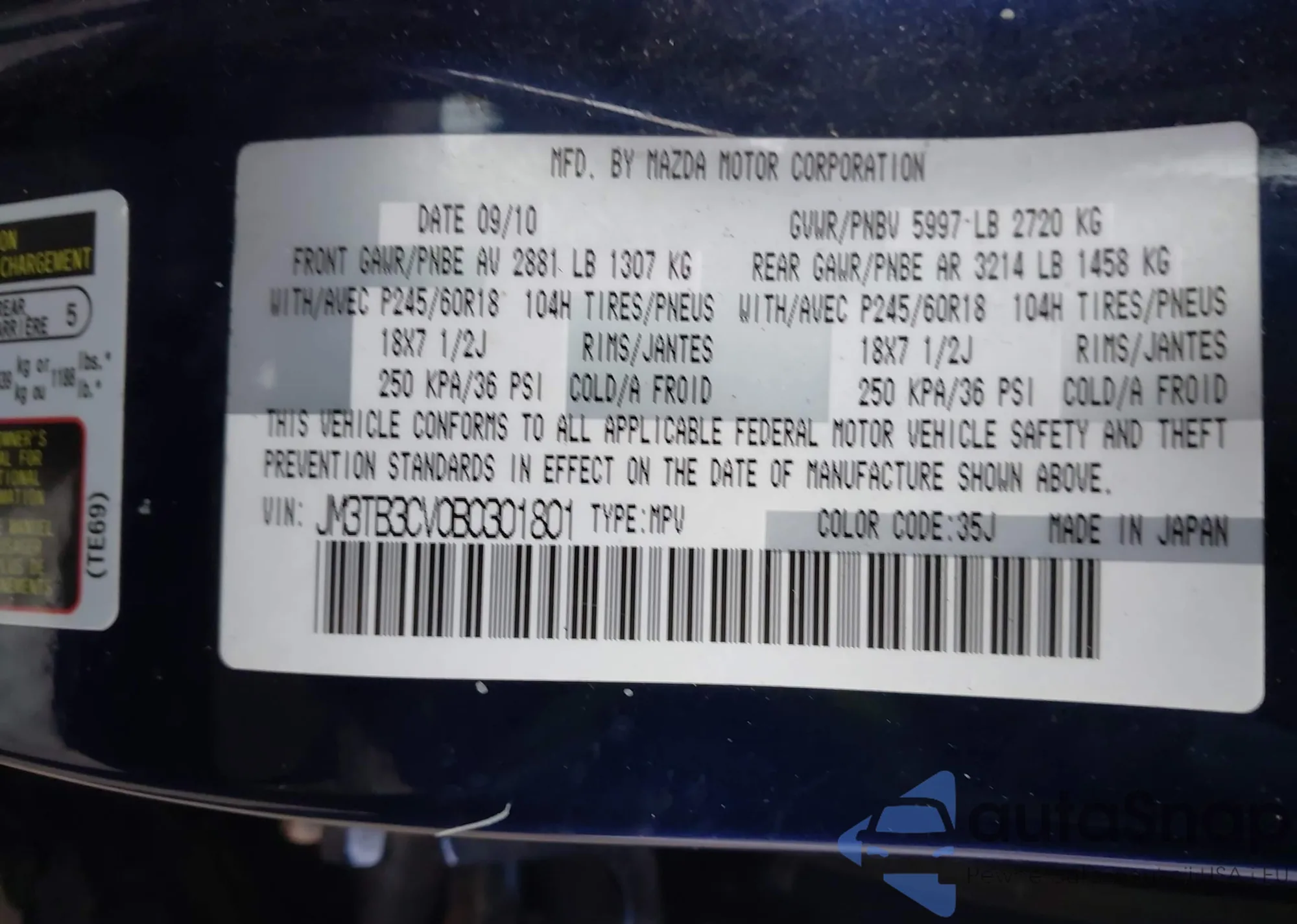 • VIN JM3TB3CV0B0301801