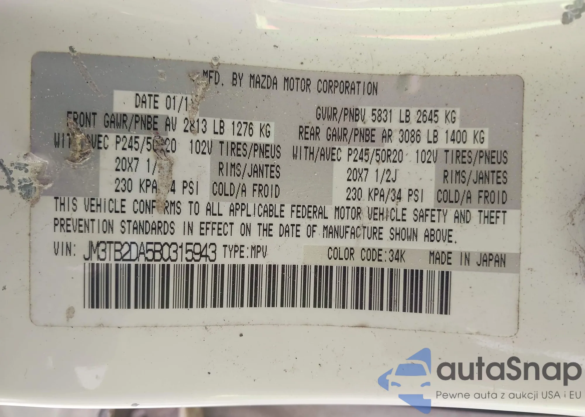 • VIN JM3TB2DA5B0315943