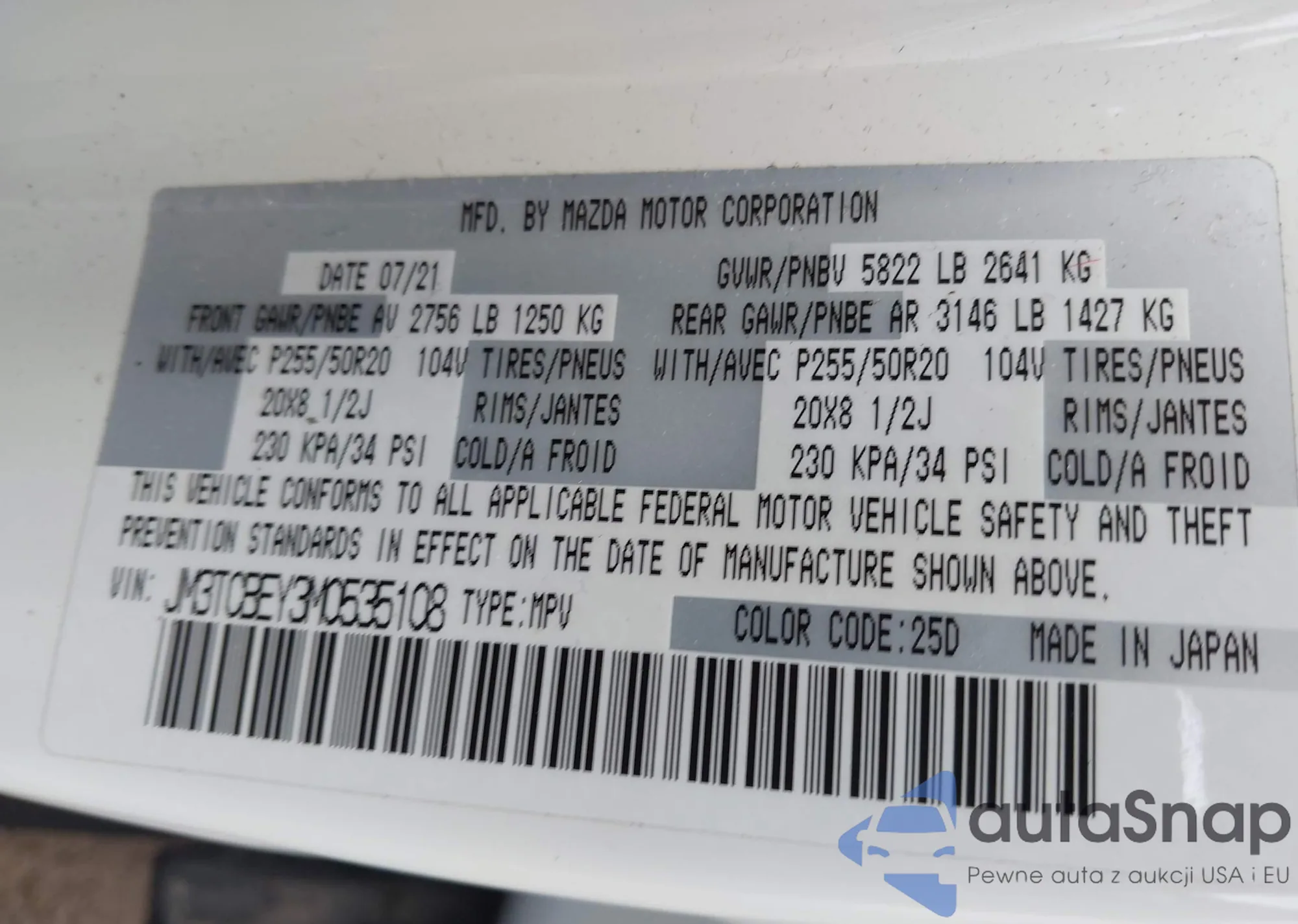 LOT: 43934973 VIN: JM3TCBDY8M0534439
