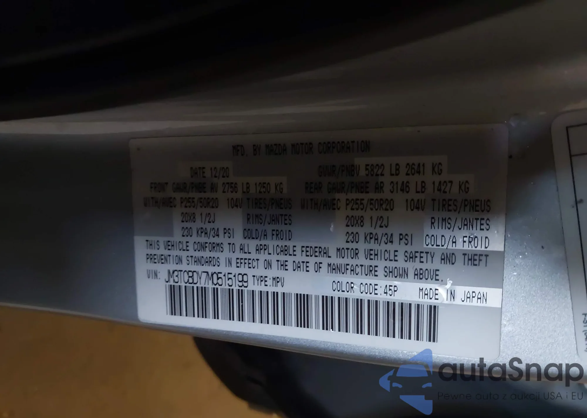 LOT: 44002060 VIN: JM3TCBDY7M0515199