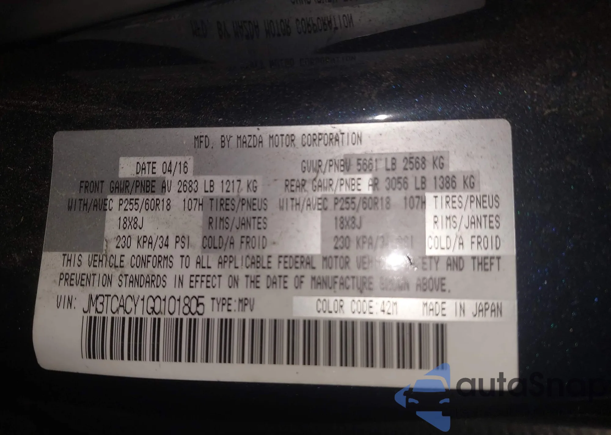 • VIN JM3TCACY1G0101805
