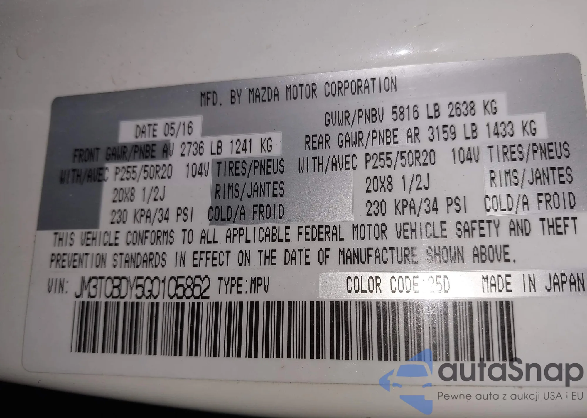 LOT: 43838780 VIN: JM3TCBDY5G0105862
