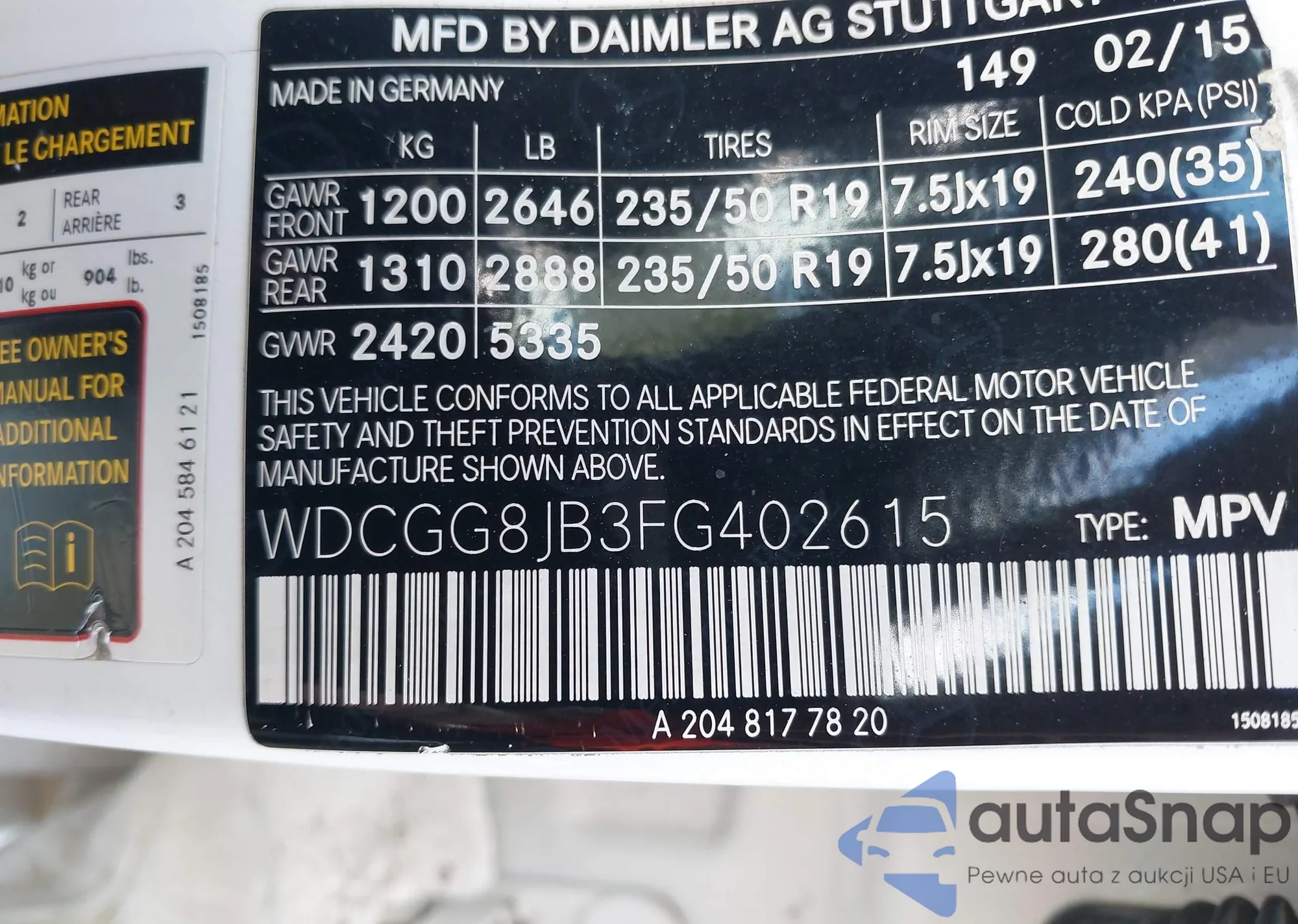 • VIN WDCGG8JB3FG402615