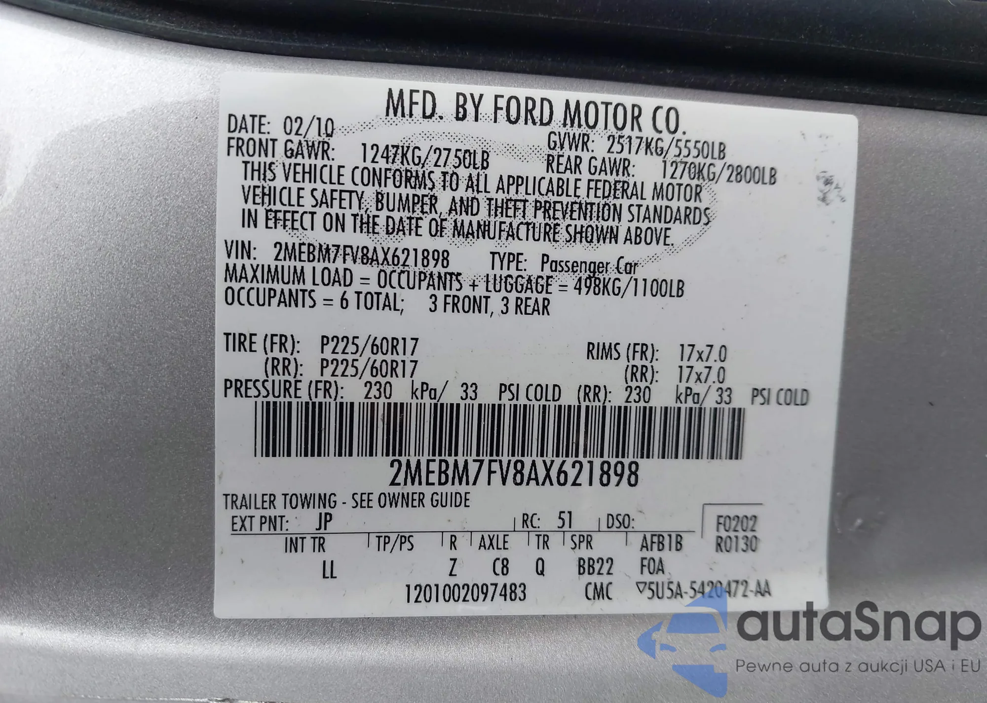LOT: 43945541 VIN: 2MEBM7FV8AX621898