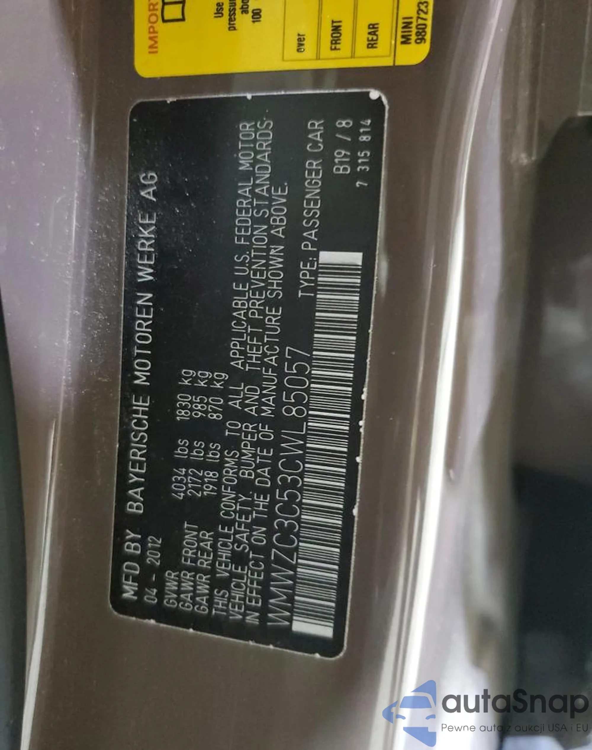 • VIN WMWZC3C53CWL85057