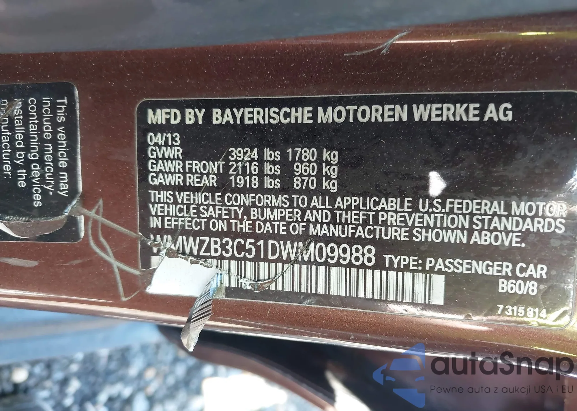 LOT: 42823215 VIN: WMWZB3C51DWM09988