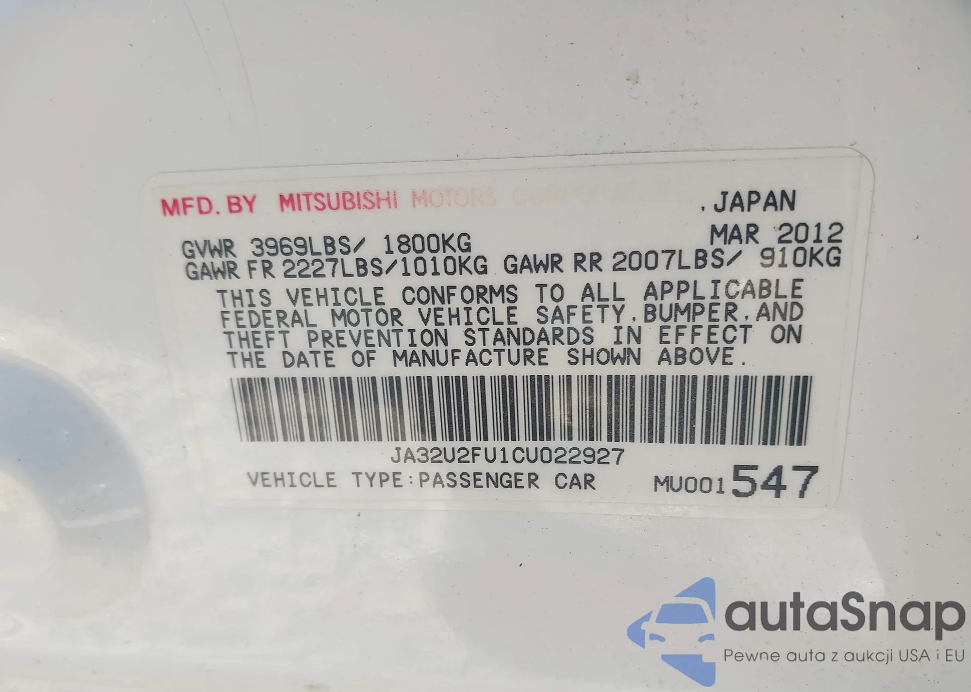 • VIN JA32U2FU1CU022927