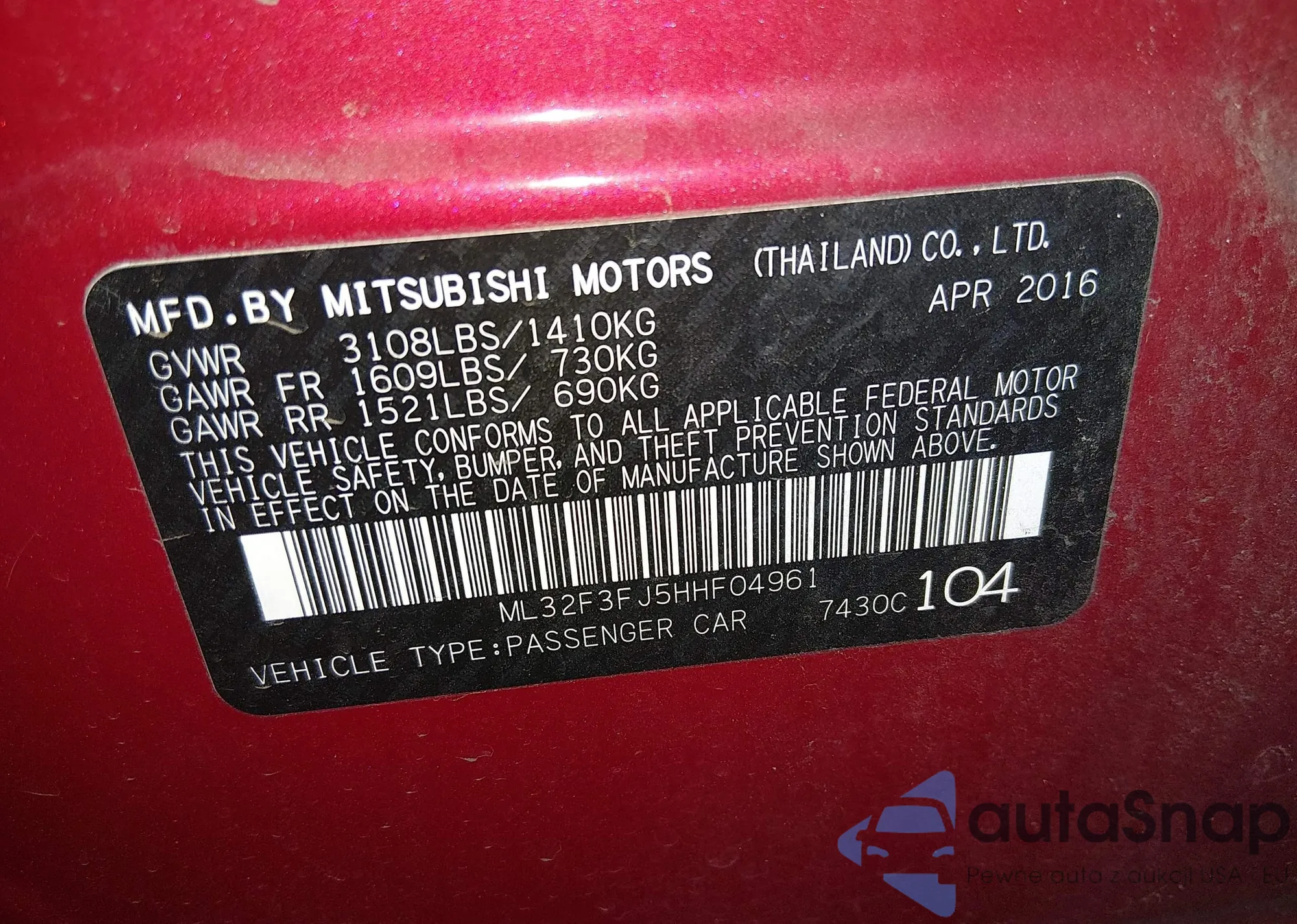 LOT: 44623147 VIN: ML32F3FJ5HHF04961