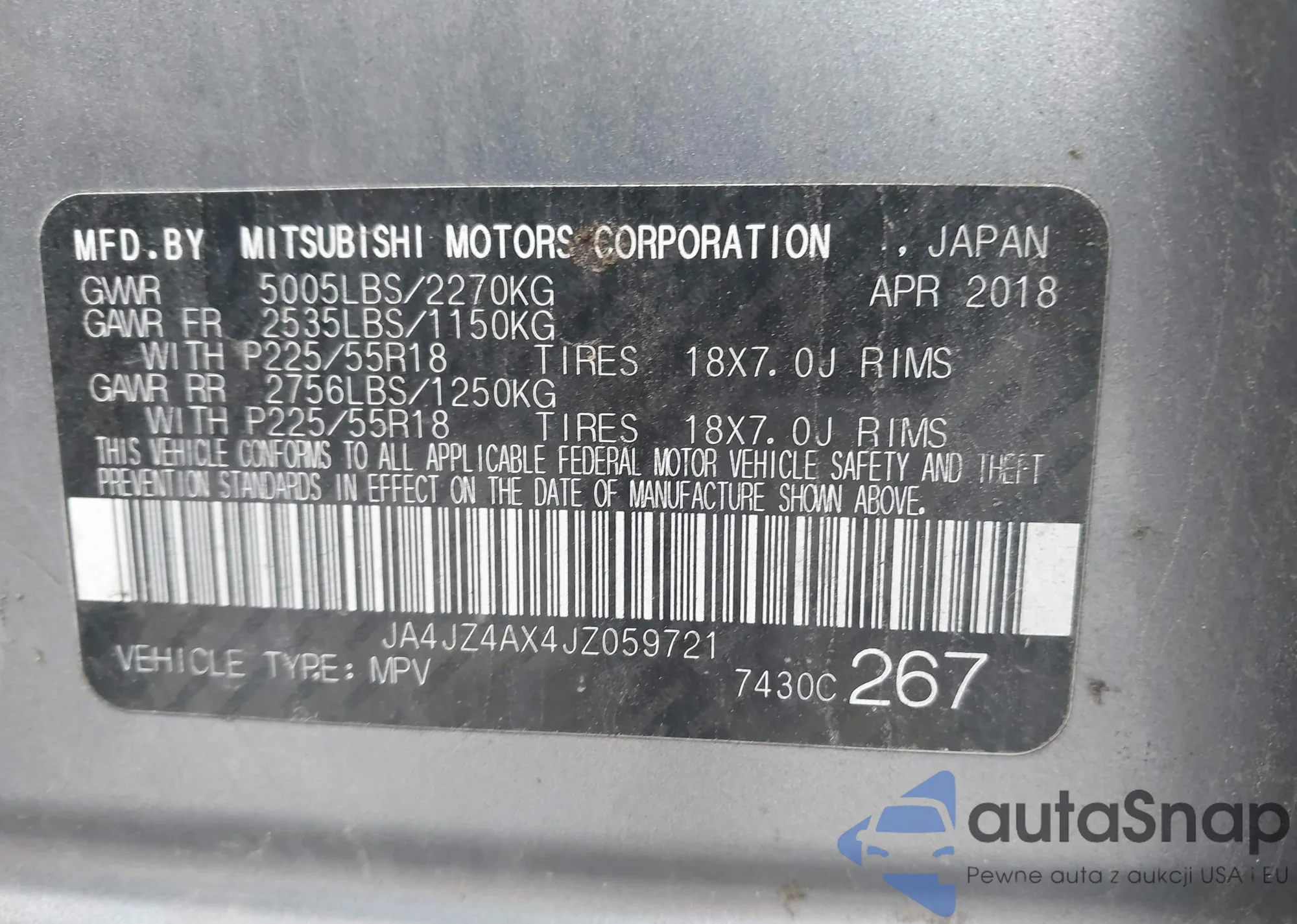 LOT: 42187648 VIN: JA4JZ4AX4JZ059721