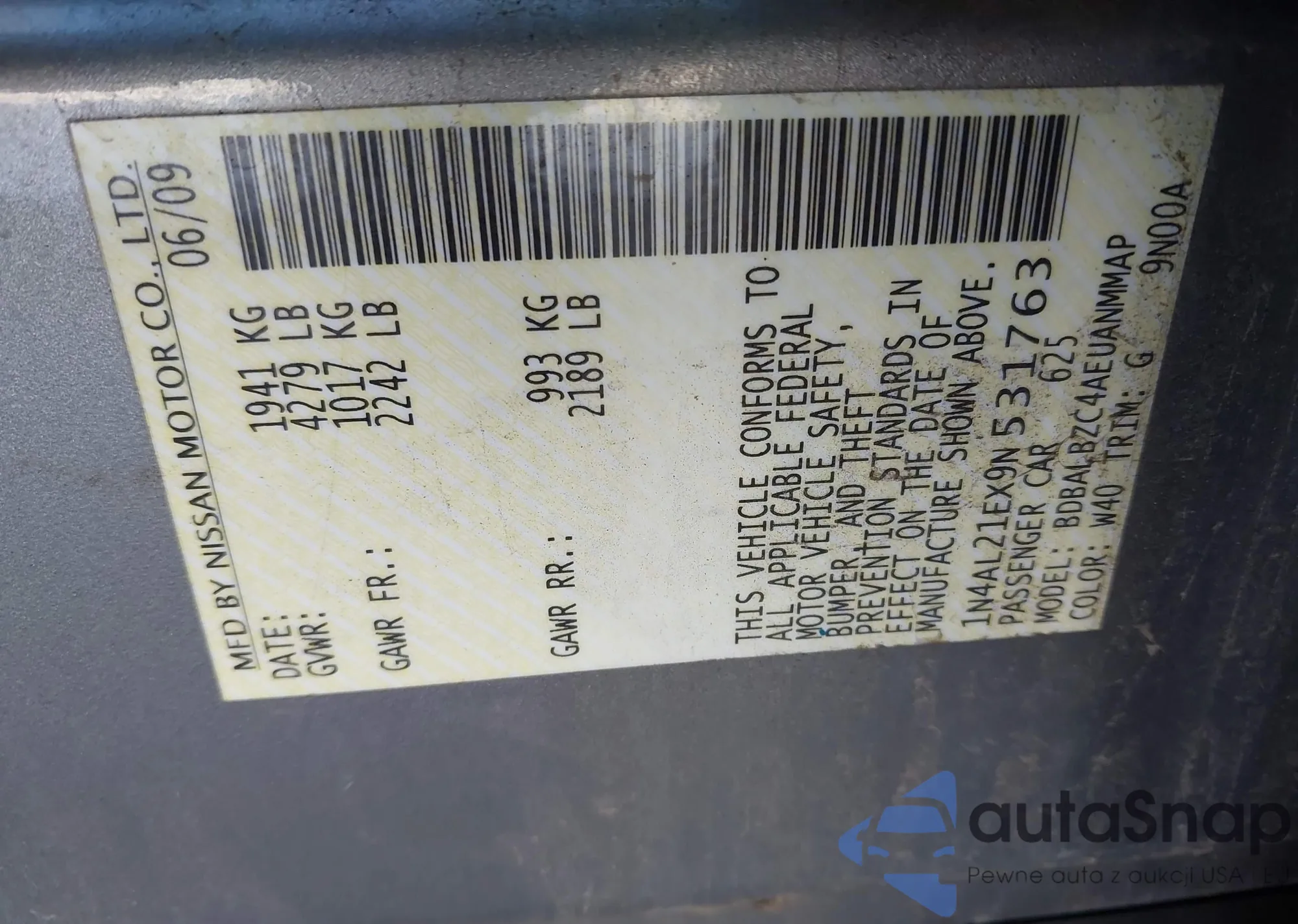 LOT: 43936733 VIN: 1N4AL21EX9N531763