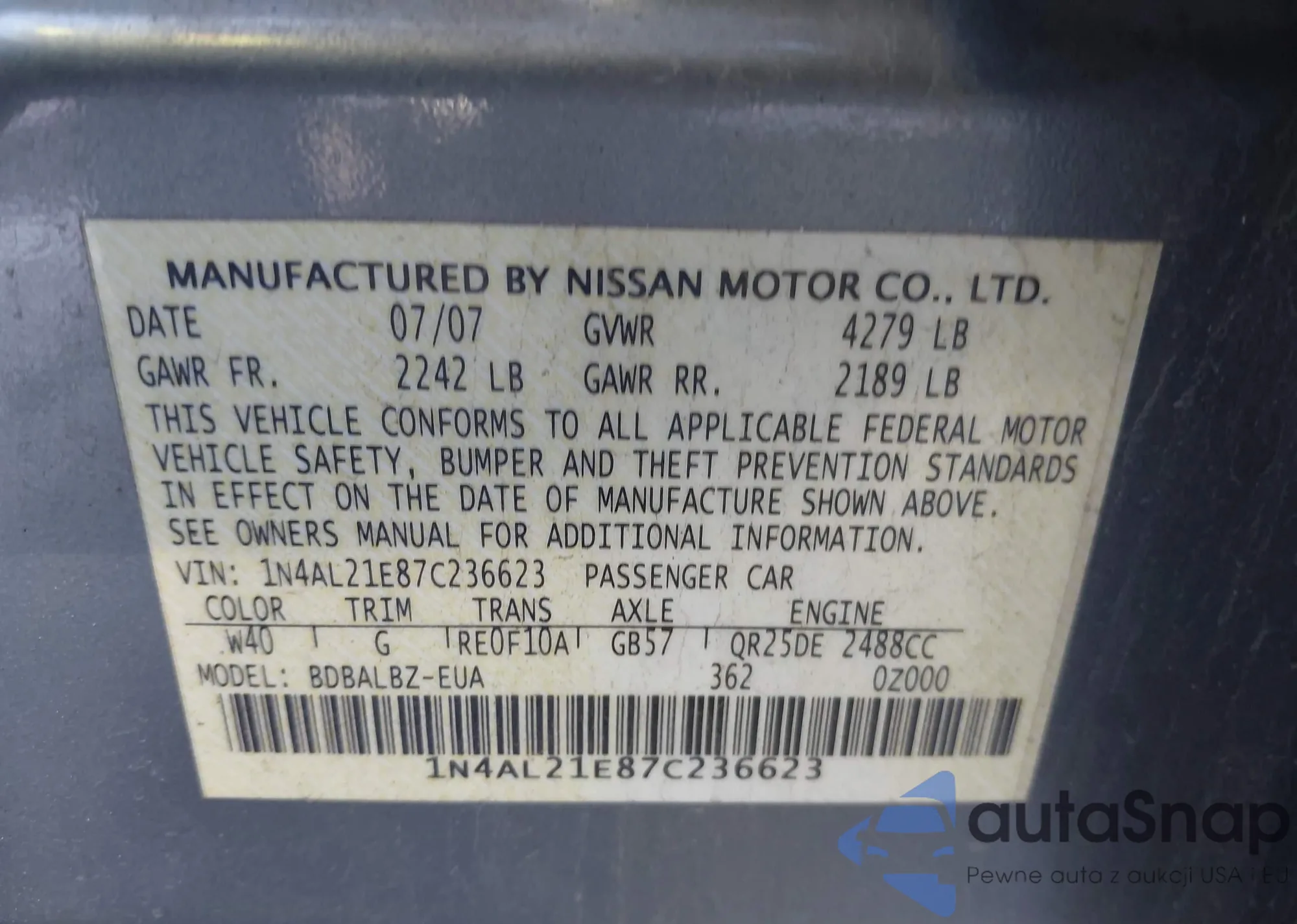 LOT: 43937975 VIN: 1N4AL21E87C236623