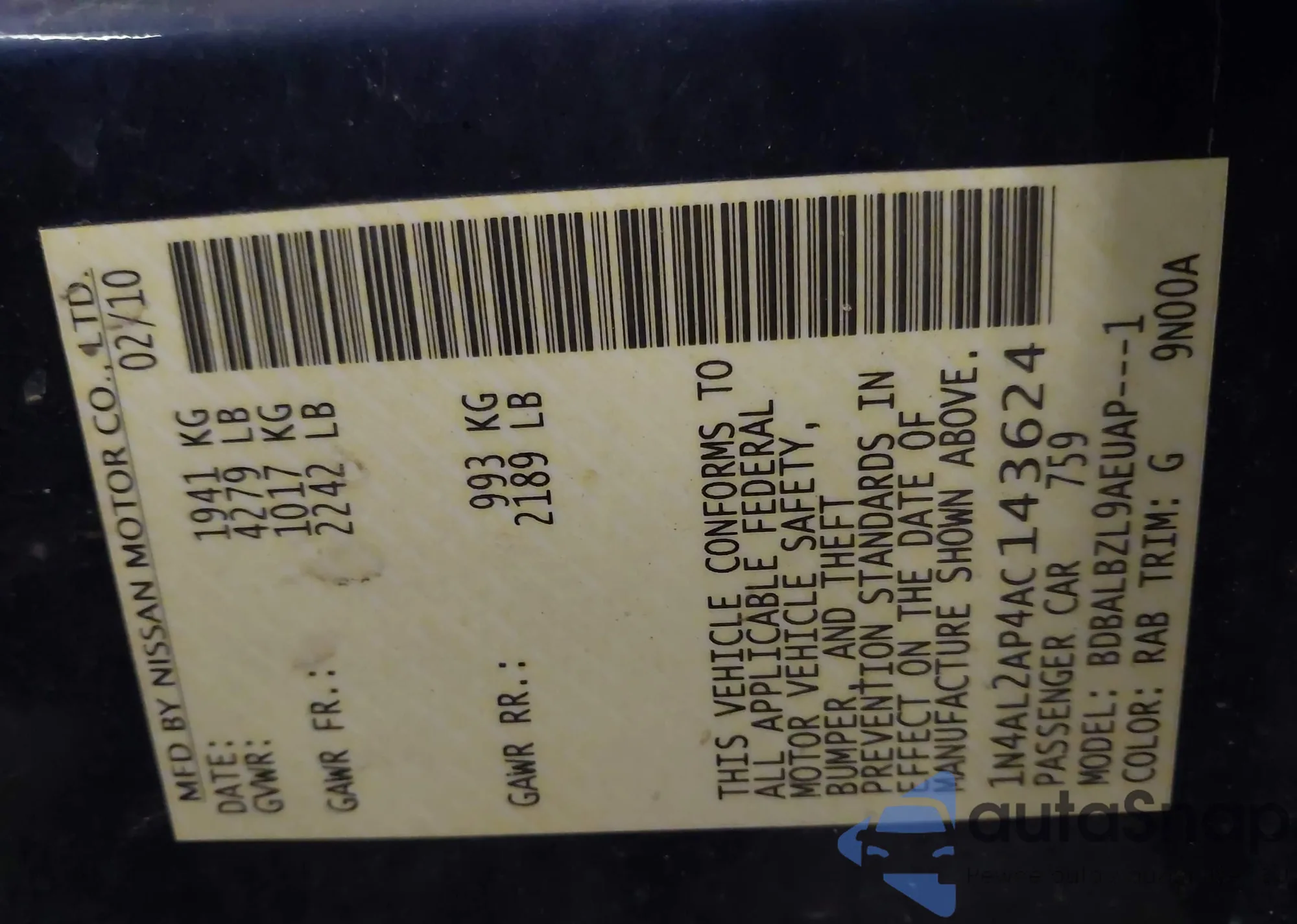 • VIN 1N4AL2APXAN487172