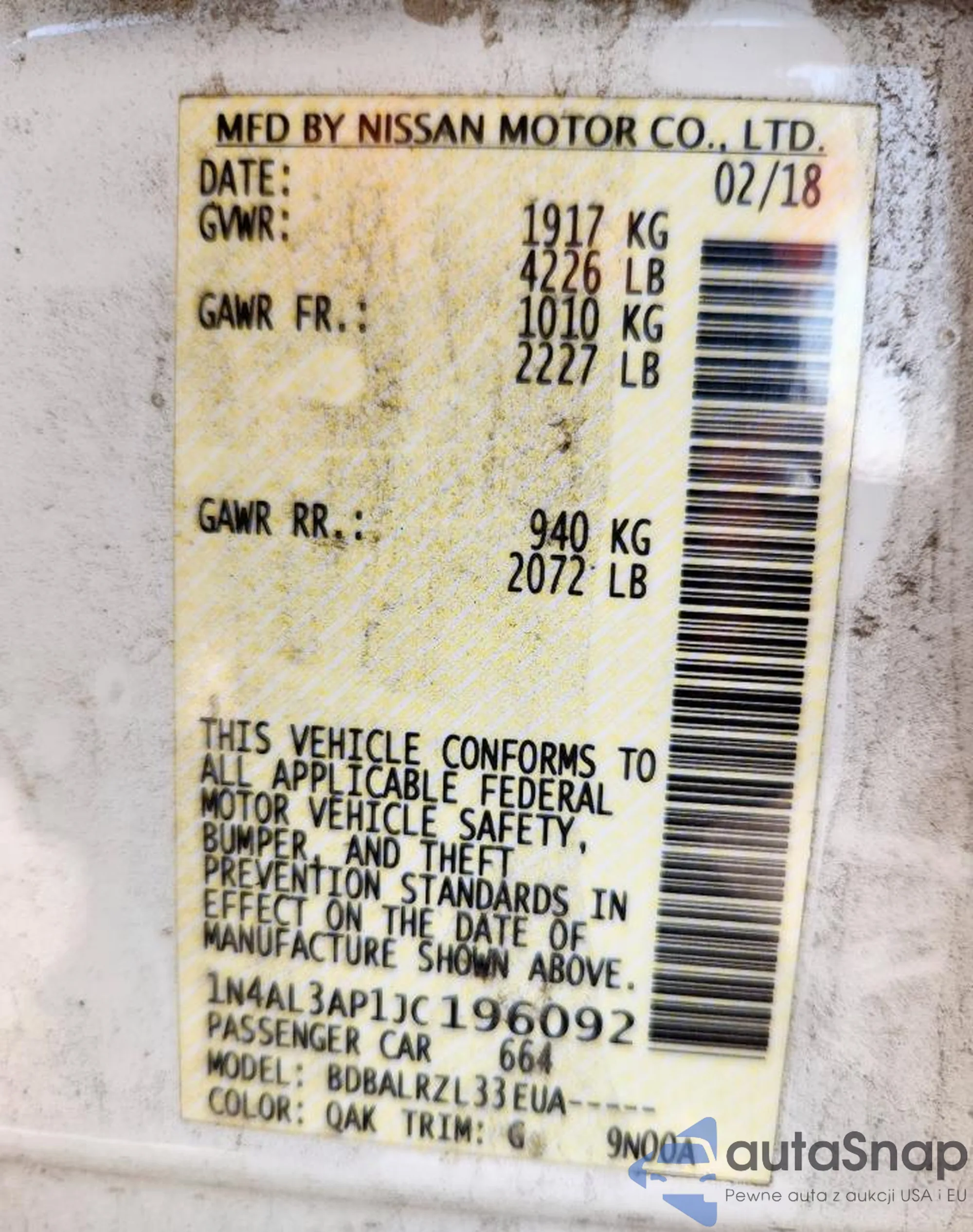 LOT: 81902125 VIN: 1N4AL3AP2JC139044