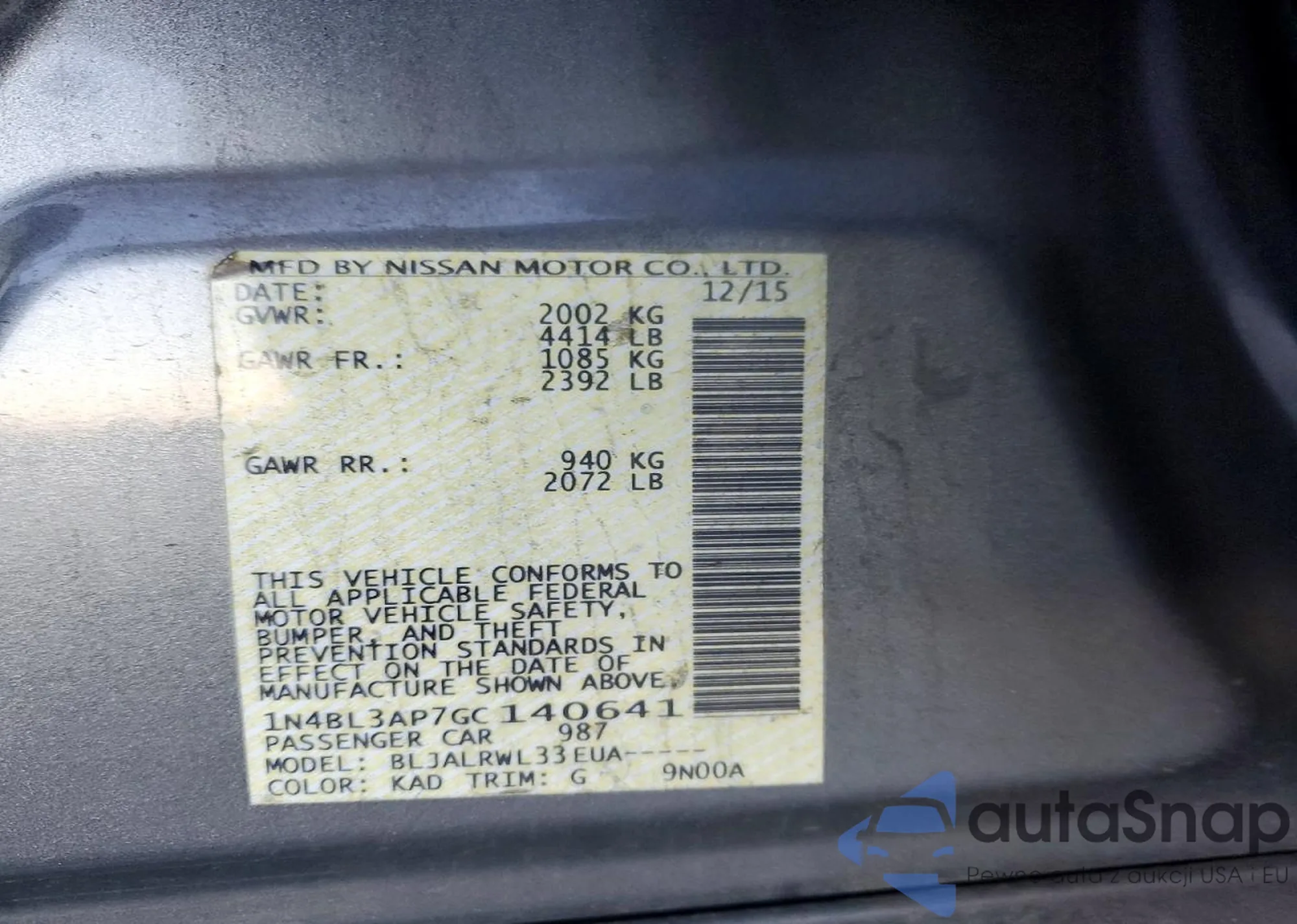 • VIN 1N4BL3AP7GC140641