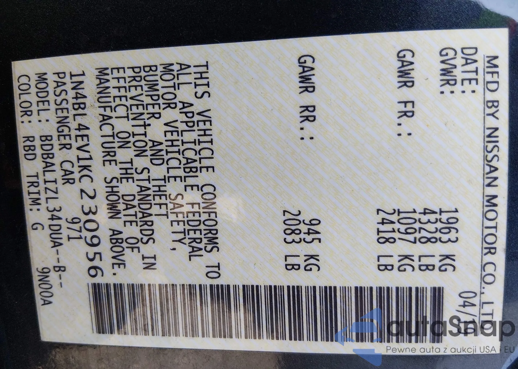 LOT: 44172305 VIN: 1N4BL4EV1KC230956