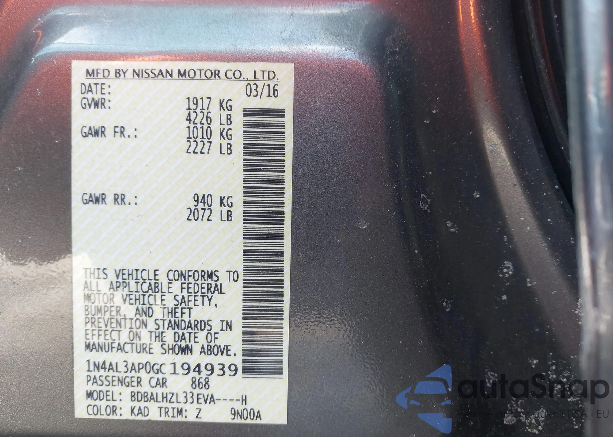 • VIN 1N4AL3AP0GC194939