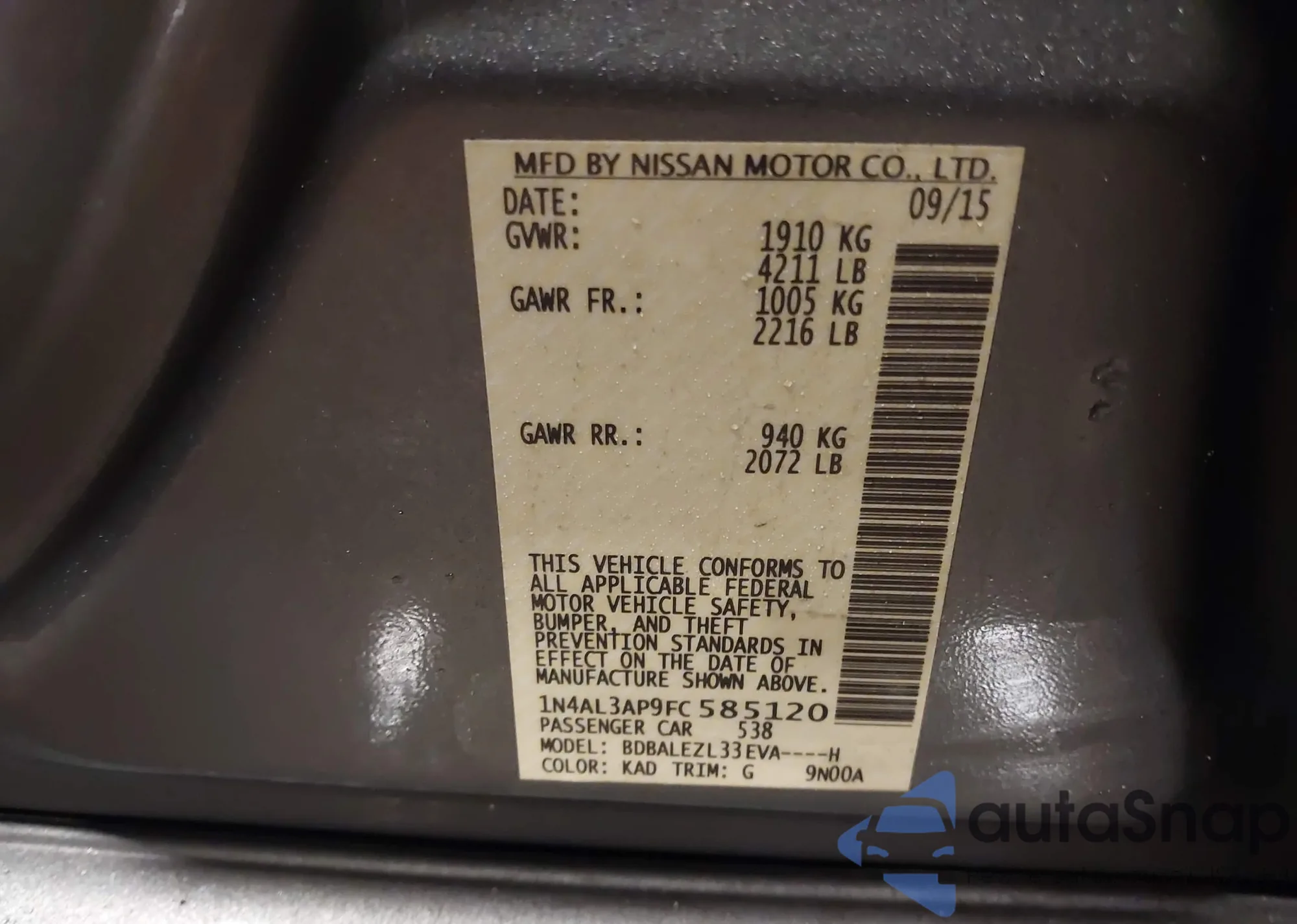• VIN 1N4AL3AP9FC585120