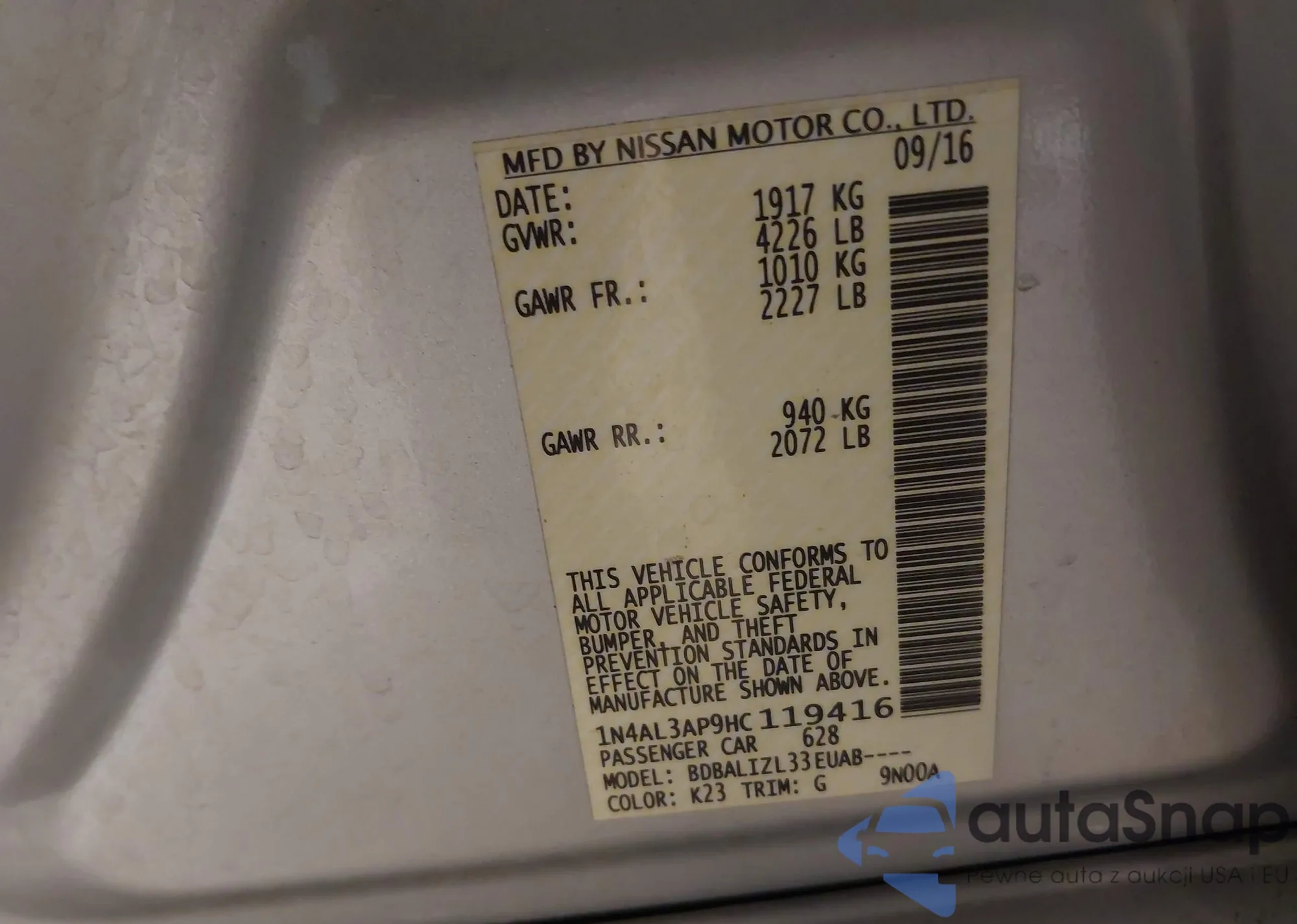 LOT: 43998233 VIN: 1N4AL3AP9HC119416