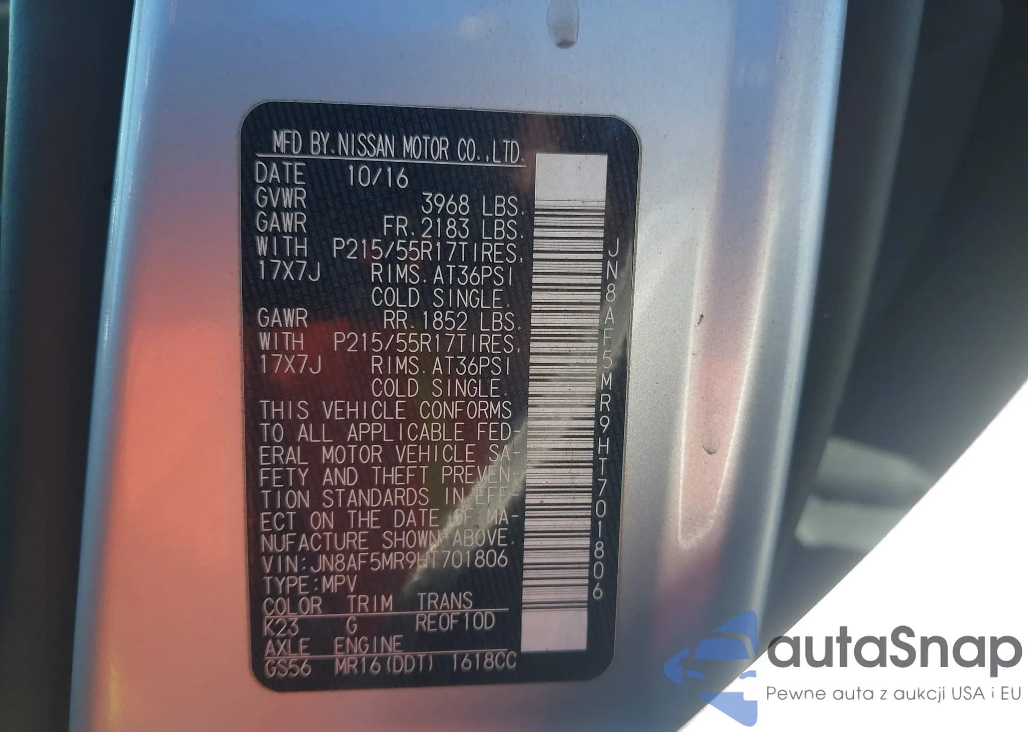 LOT: 44119812 VIN: JN8AF5MR9HT701806