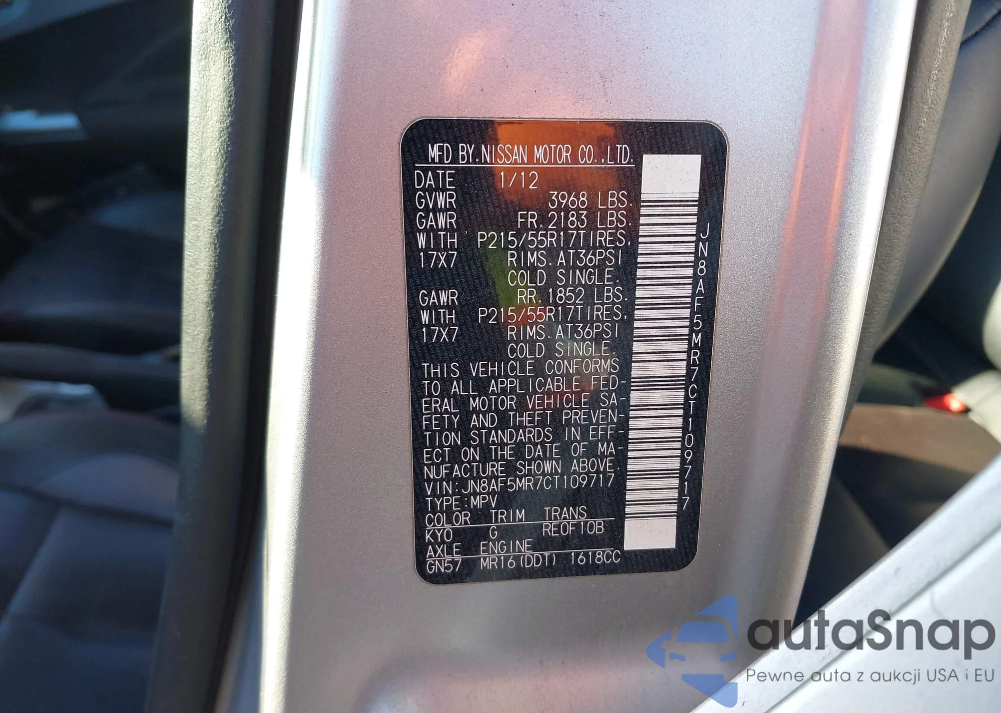 LOT: 44217334 VIN: JN8AF5MR7CT109717