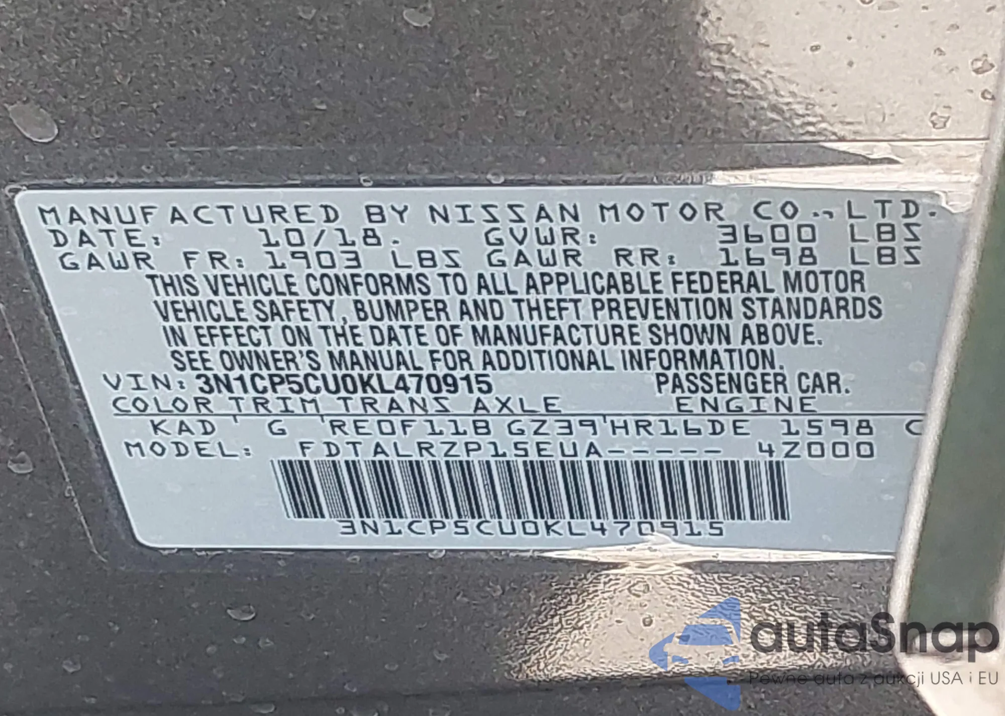 LOT: 43916157 VIN: 3N1CP5CU0KL470915