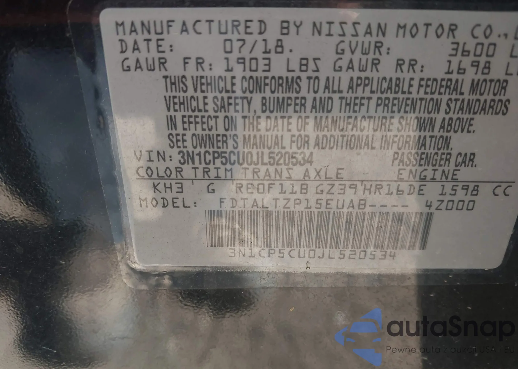 LOT: 43672196 VIN: 3N1CP5CU0JL520534