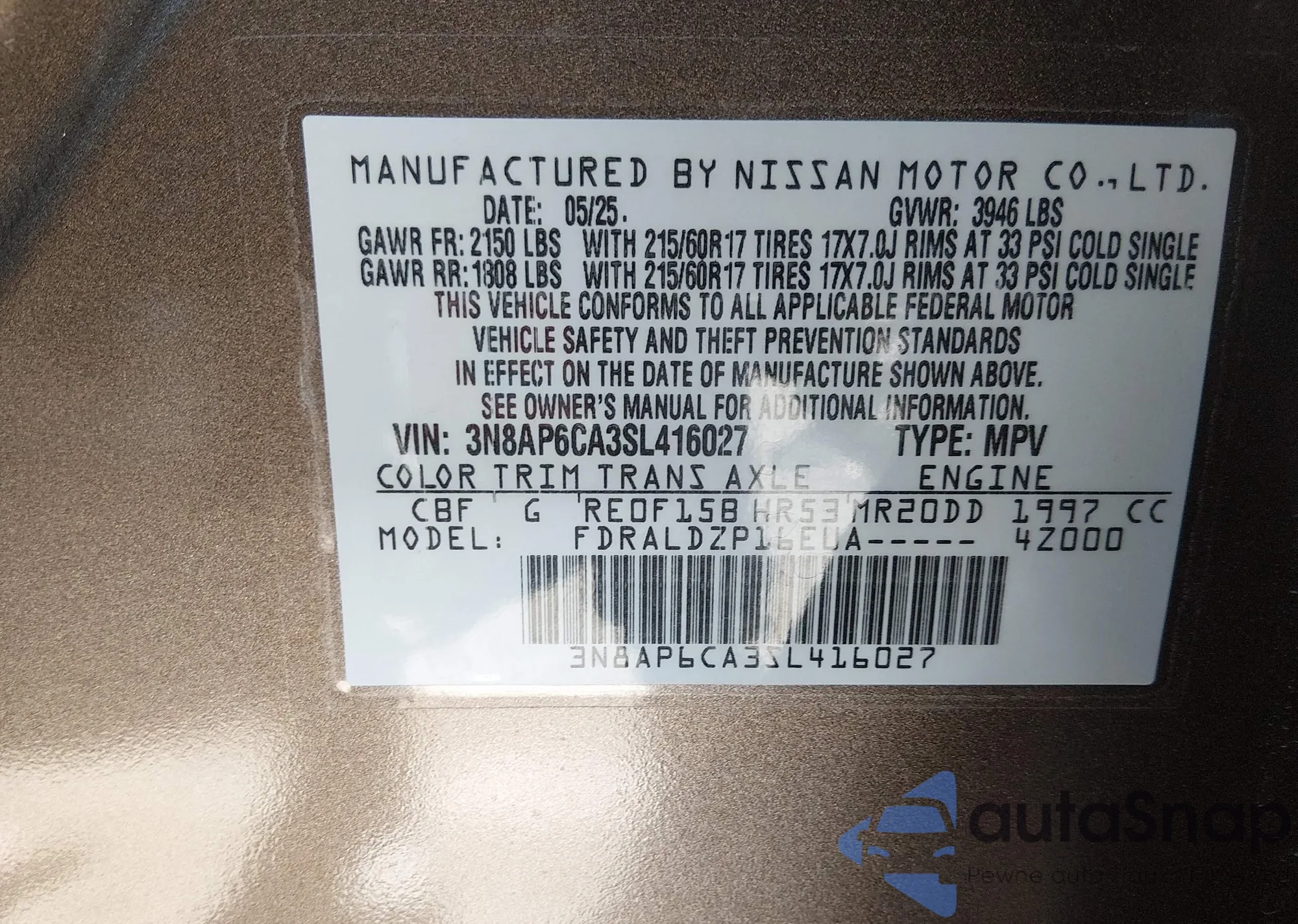 • VIN 3N8AP6CA3SL416027