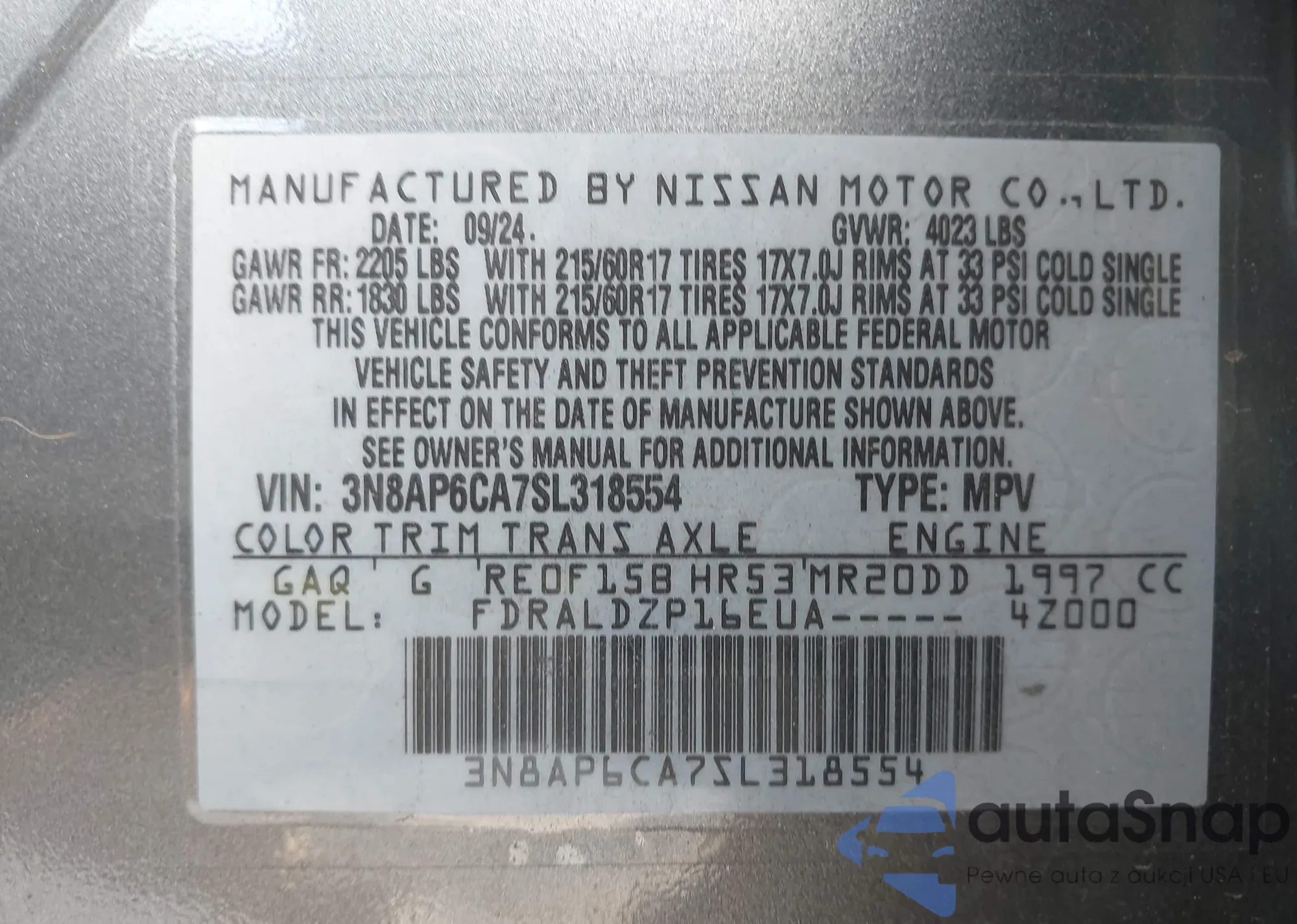 • VIN 3N8AP6CA7SL318554