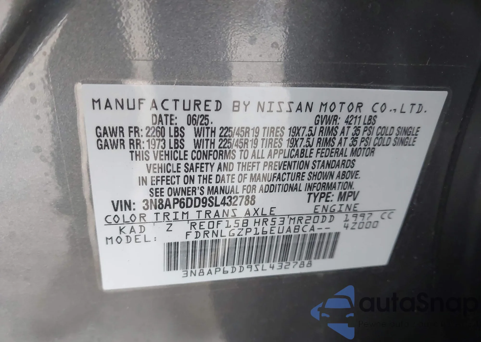 • VIN 3N8AP6DD9SL432788