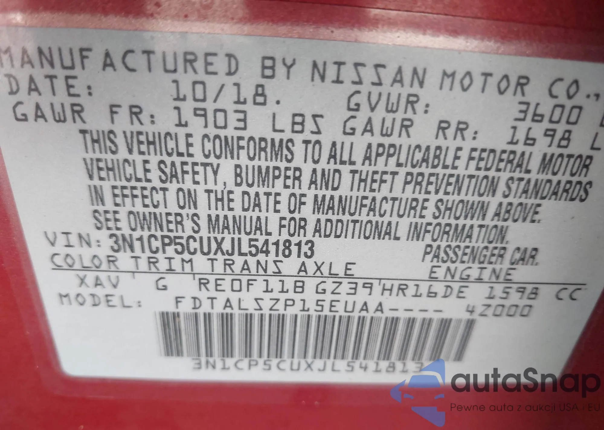 LOT: 44021325 VIN: 3N1CP5CUXJL541813
