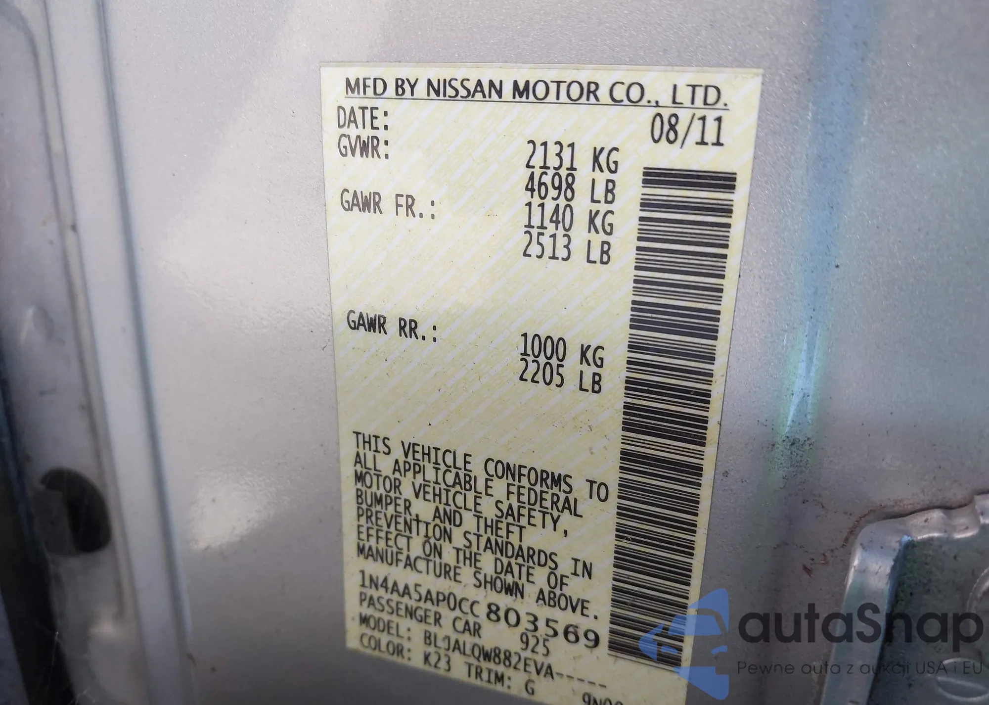 LOT: 44096851 VIN: 1N4AA5AP0CC803569
