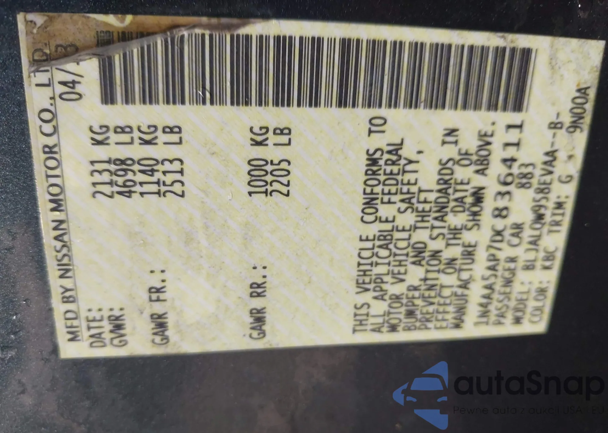 LOT: 44116435 VIN: 1N4AA5AP7DC836411