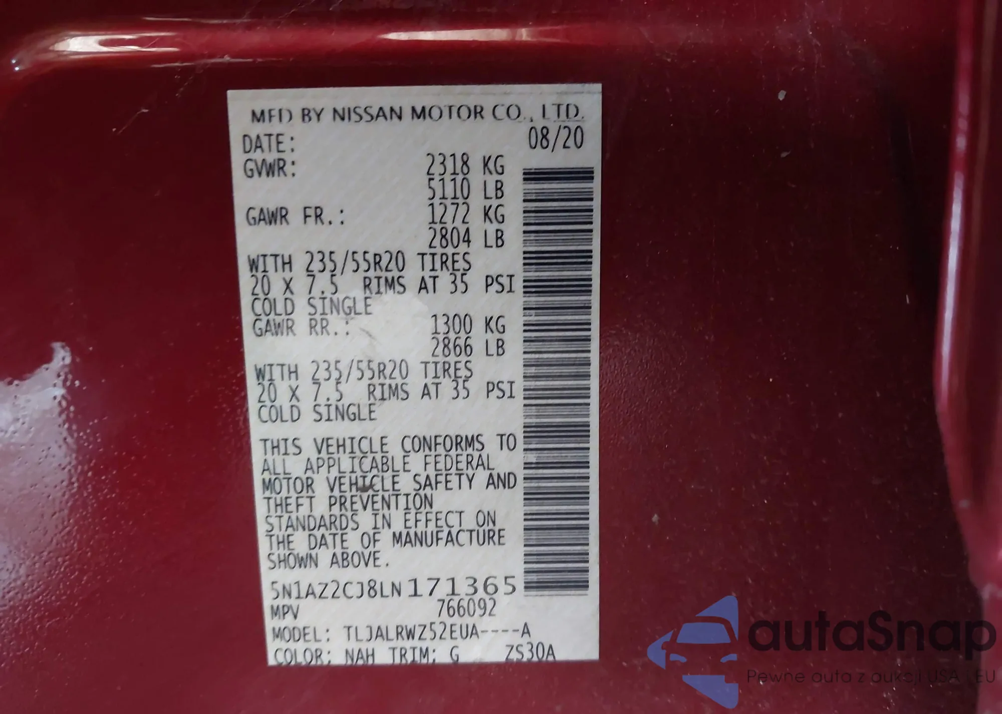 • VIN 5N1AZ2CJ8LN171365