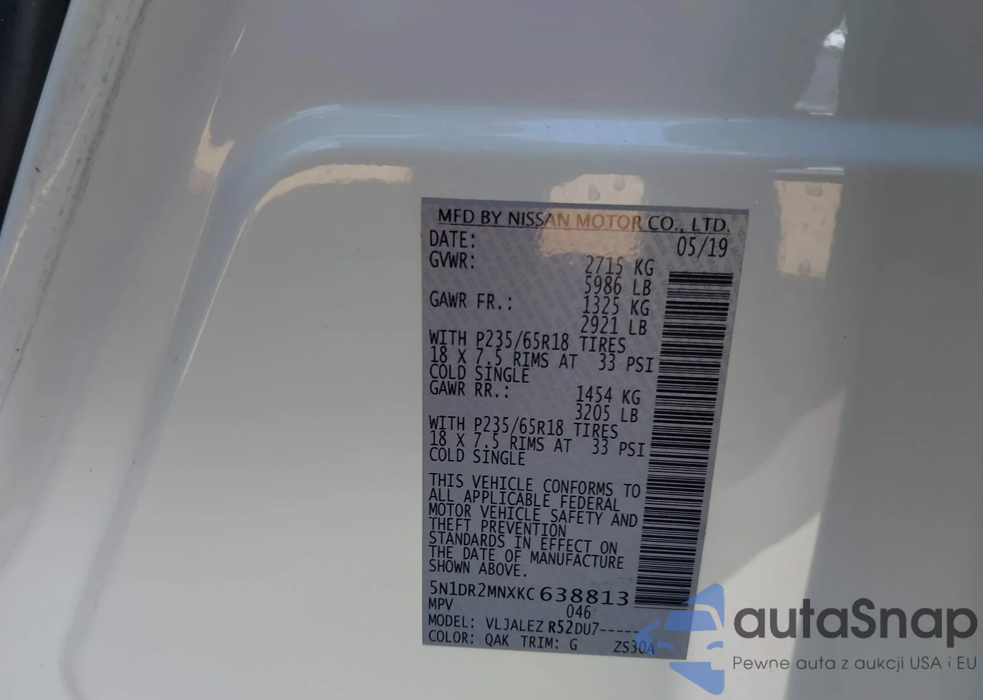 LOT: 43143117 VIN: 5N1DR2MNXKC638813